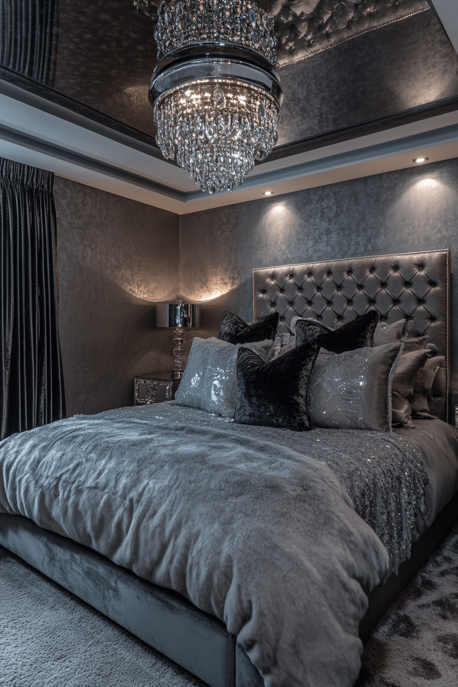 Sparkling crystal accents turn this luxury bedroom master into a dazzling showpiece. Statement chandeliers, mirrored surfaces, and reflective décor capture and scatter light throughout the space. Every detail is meant to impress.