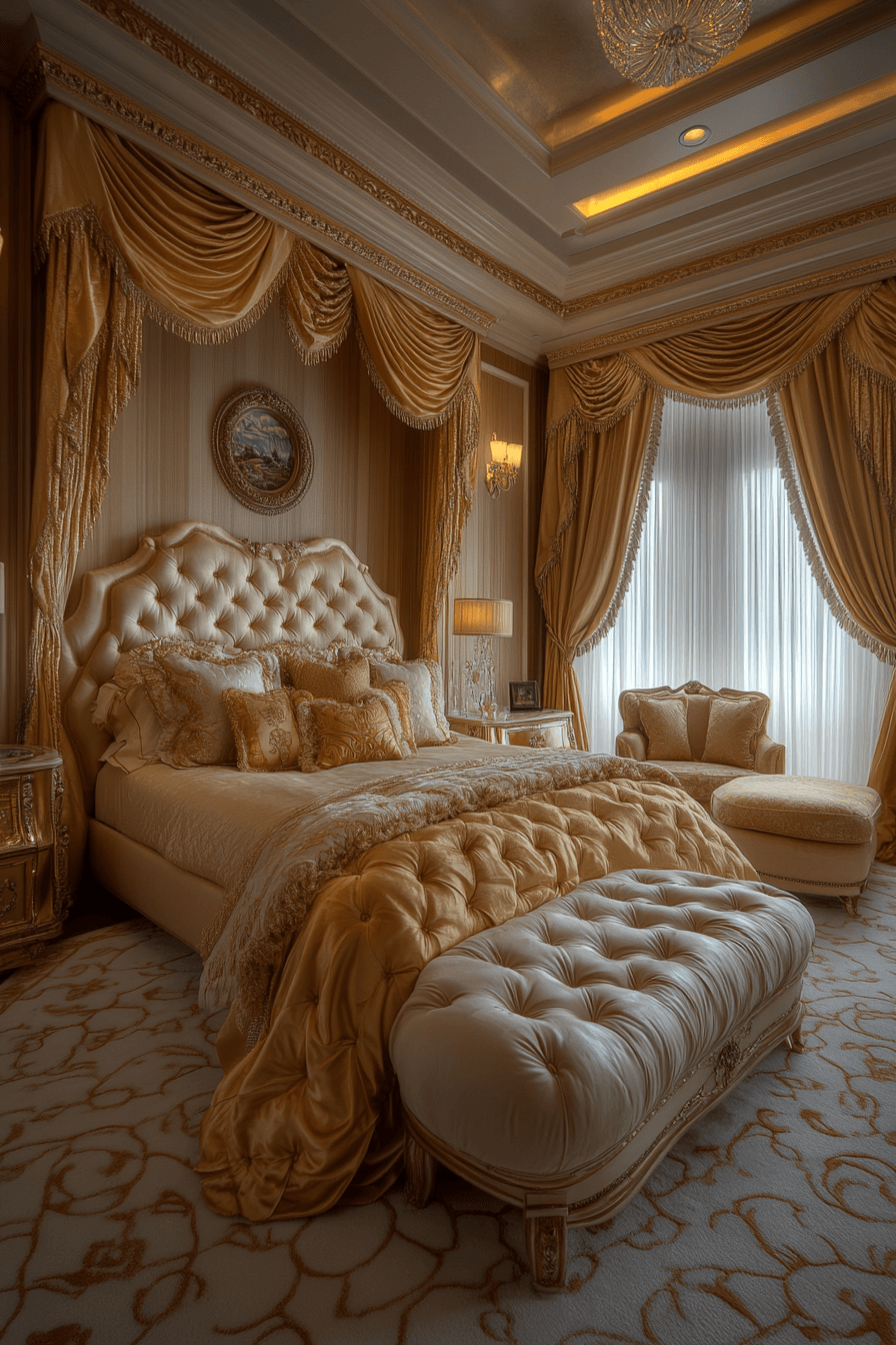 Lustrous silk fabrics drape this luxury bedroom master in pure elegance. From bedding to curtains, every surface reflects light with a refined glow. Rich colors and intricate patterns bring a sense of opulence that feels both timeless and indulgent.