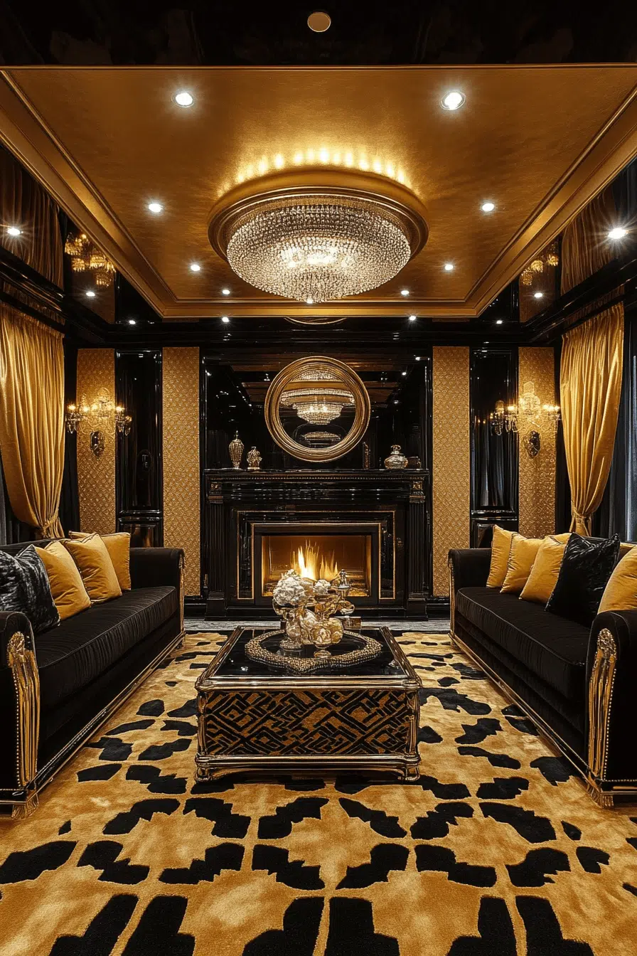 Step into elegance with a luxury living room featuring bold patterns and rich hues from the Art Deco era. Affordable velvet pillows and metallic accents from thrift stores add a touch of glamour without a big spend. Simple chandeliers and symmetry create a grand vibe on a budget.