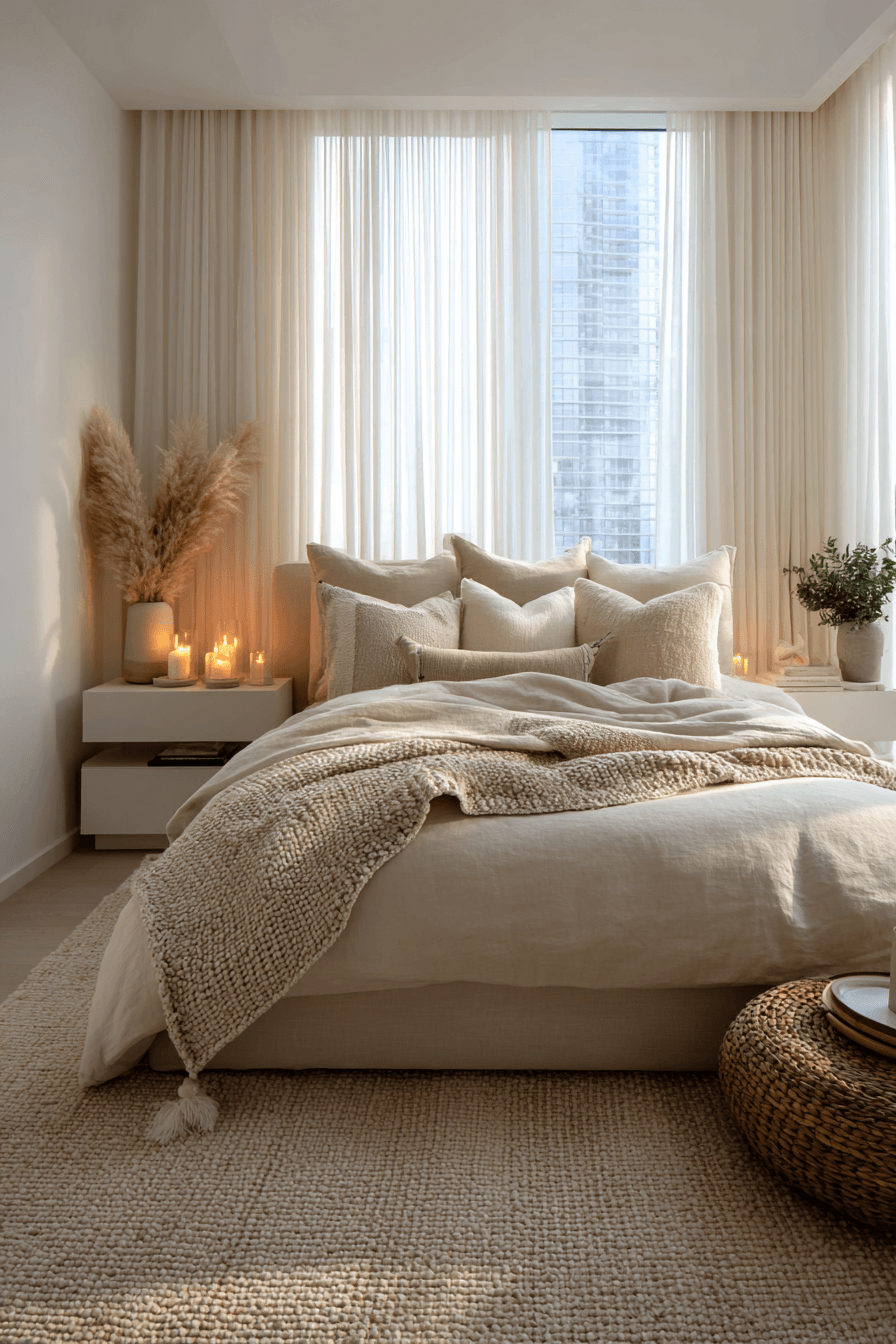 Layering soft neutrals can turn a modern bedroom interior into a cozy yet refined retreat that feels inviting from the moment you step in. Creams, beiges, and warm taupes create a soothing base that’s easy to build on. Textured bedding and layered pillows add depth and comfort without cluttering the space. Natural rugs and simple furniture help tie everything together seamlessly. Gentle lighting completes the atmosphere with a warm glow. Click to discover more modern bedroom interior ideas with cozy neutral layers.