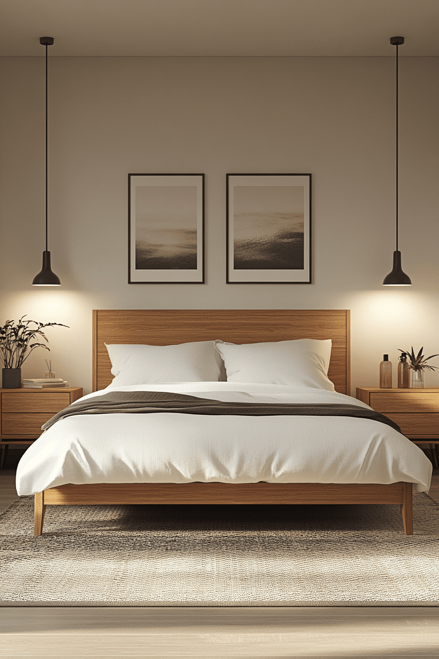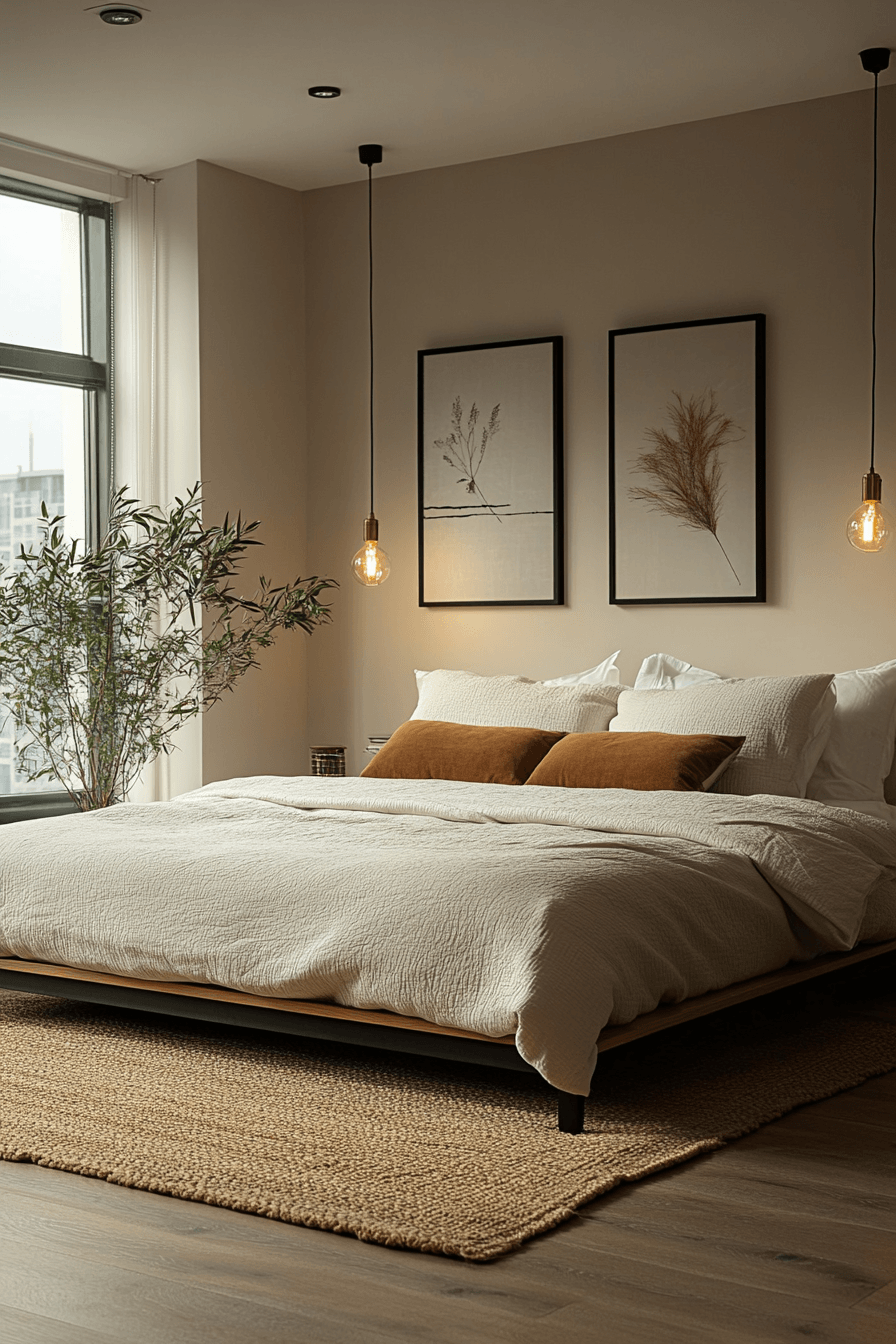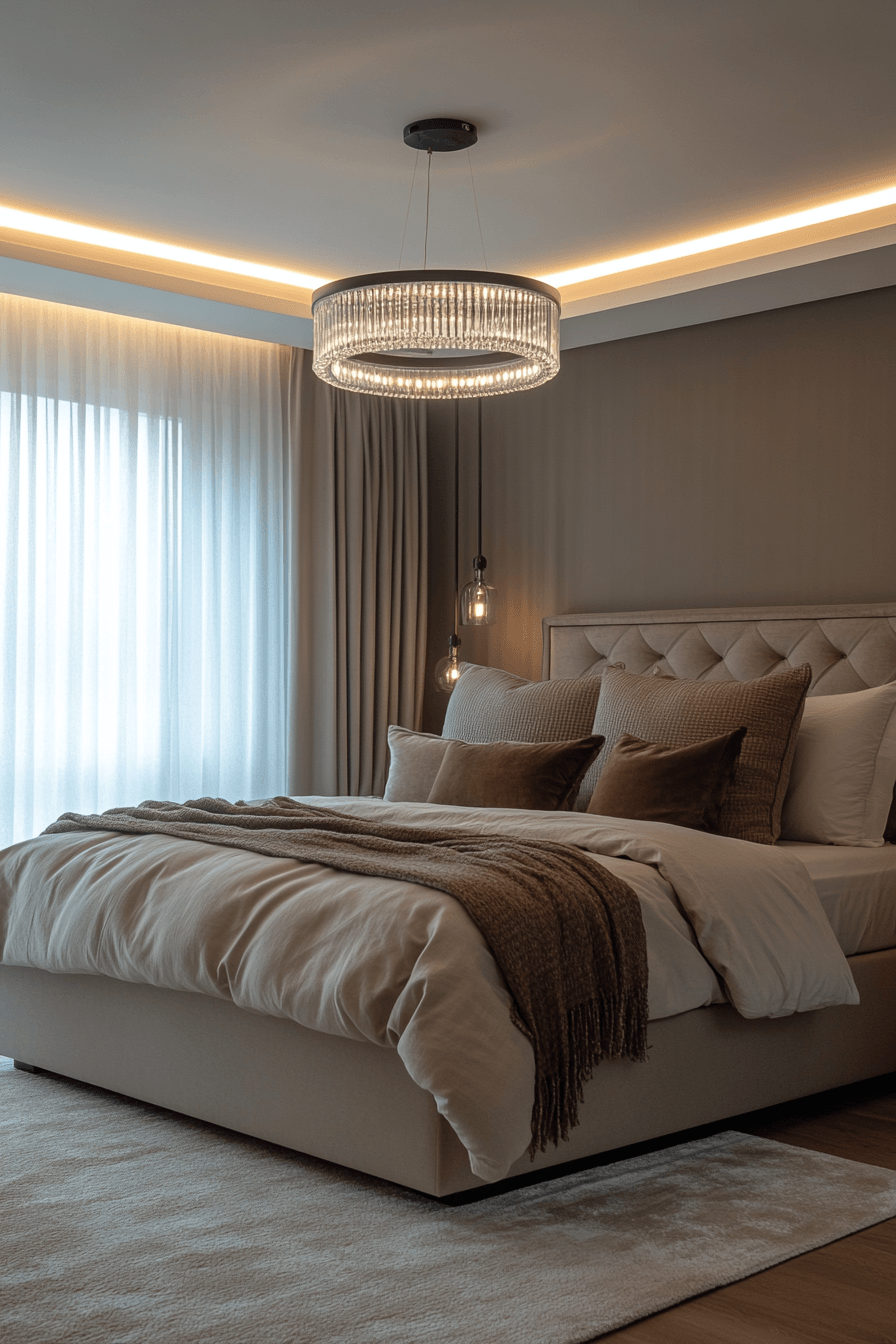 Striking lighting choices can instantly elevate a modern bedroom interior and give it a bold, designer feel. Sculptural pendants, oversized lamps, or sleek chandeliers become standout features in the room. Layered lighting, including hidden LEDs, adds warmth while highlighting architectural details. Keeping furniture and bedding simple allows the fixtures to take center stage. The overall effect feels balanced, functional, and visually exciting. Tap to uncover more modern bedroom interior ideas that shine with statement lighting.
