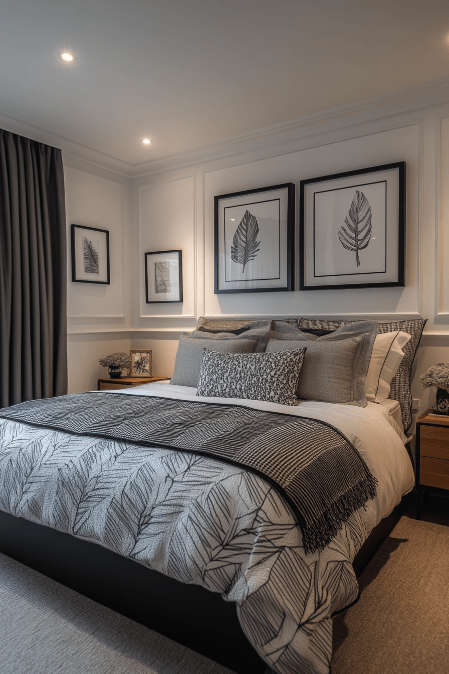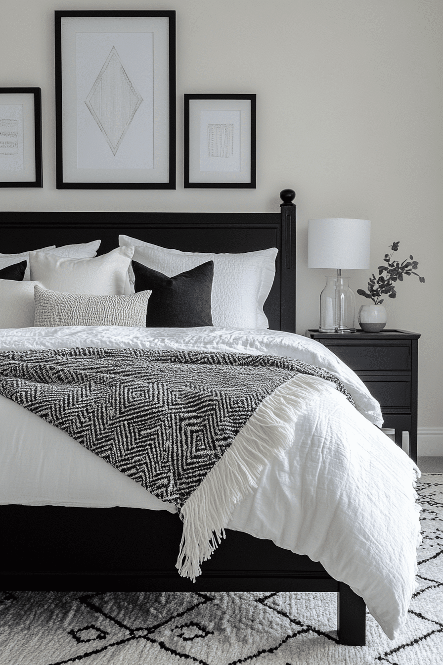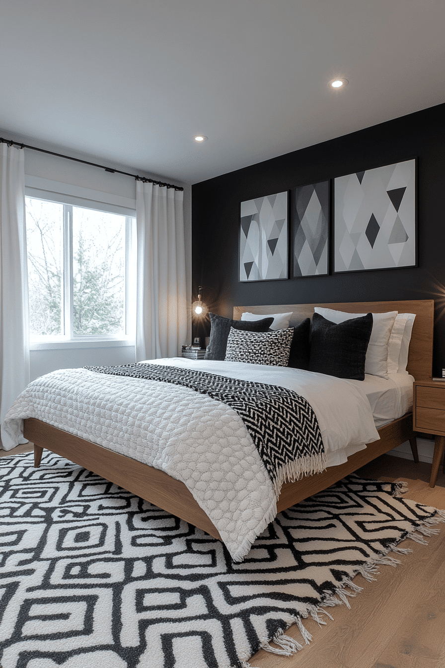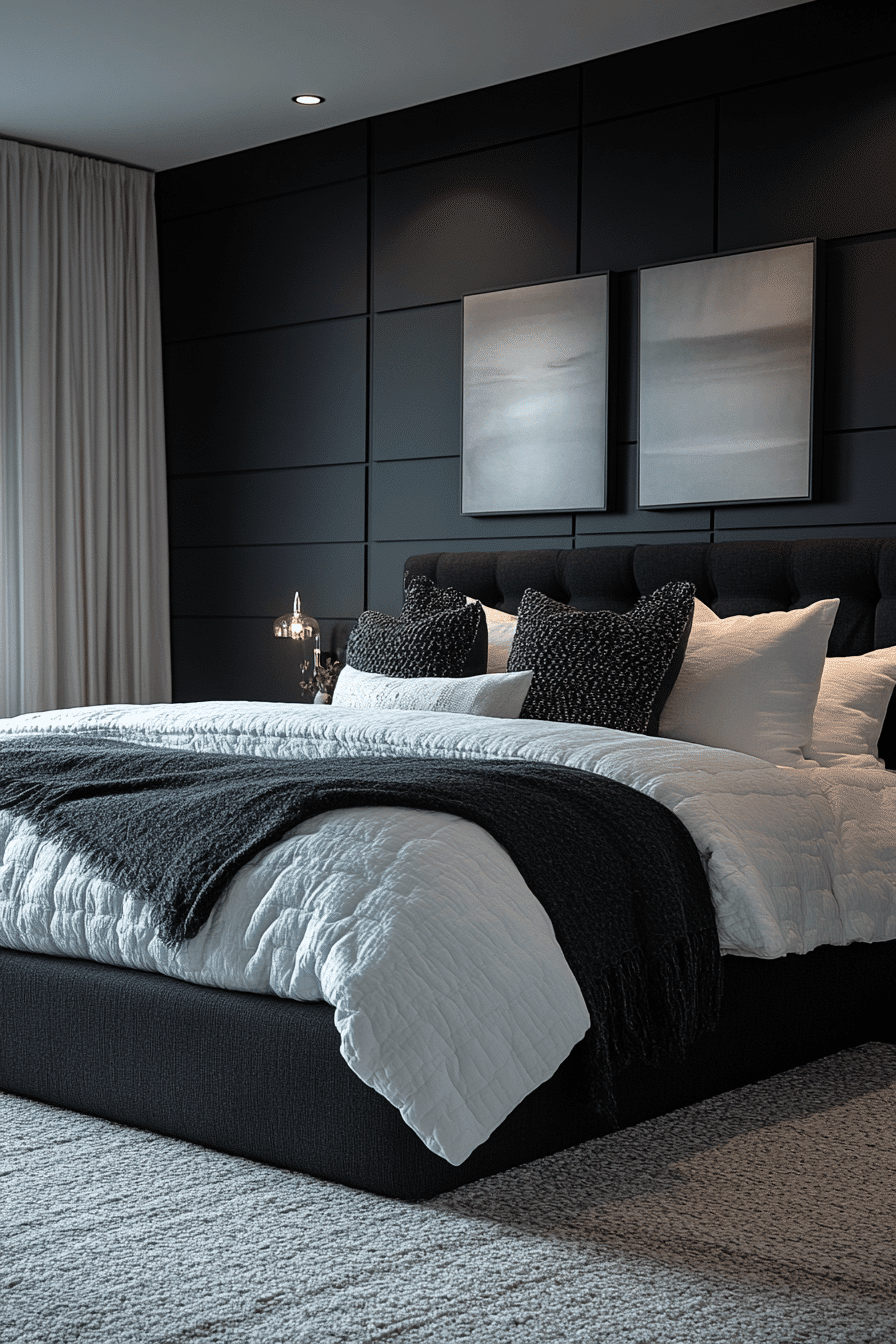 Strong contrast can give a modern bedroom interior a bold, gallery-inspired look that feels both timeless and striking. Black and white elements create instant visual impact while keeping the design clean and structured. Sleek furniture reinforces sharp lines and a polished aesthetic. Neutral bedding softens the contrast, keeping the space comfortable and balanced. A standout light fixture adds an extra layer of sophistication. Click to discover more modern bedroom interior ideas with high-contrast style.