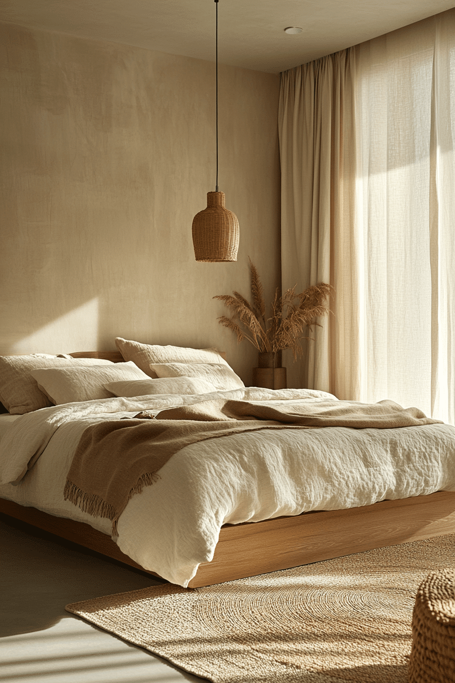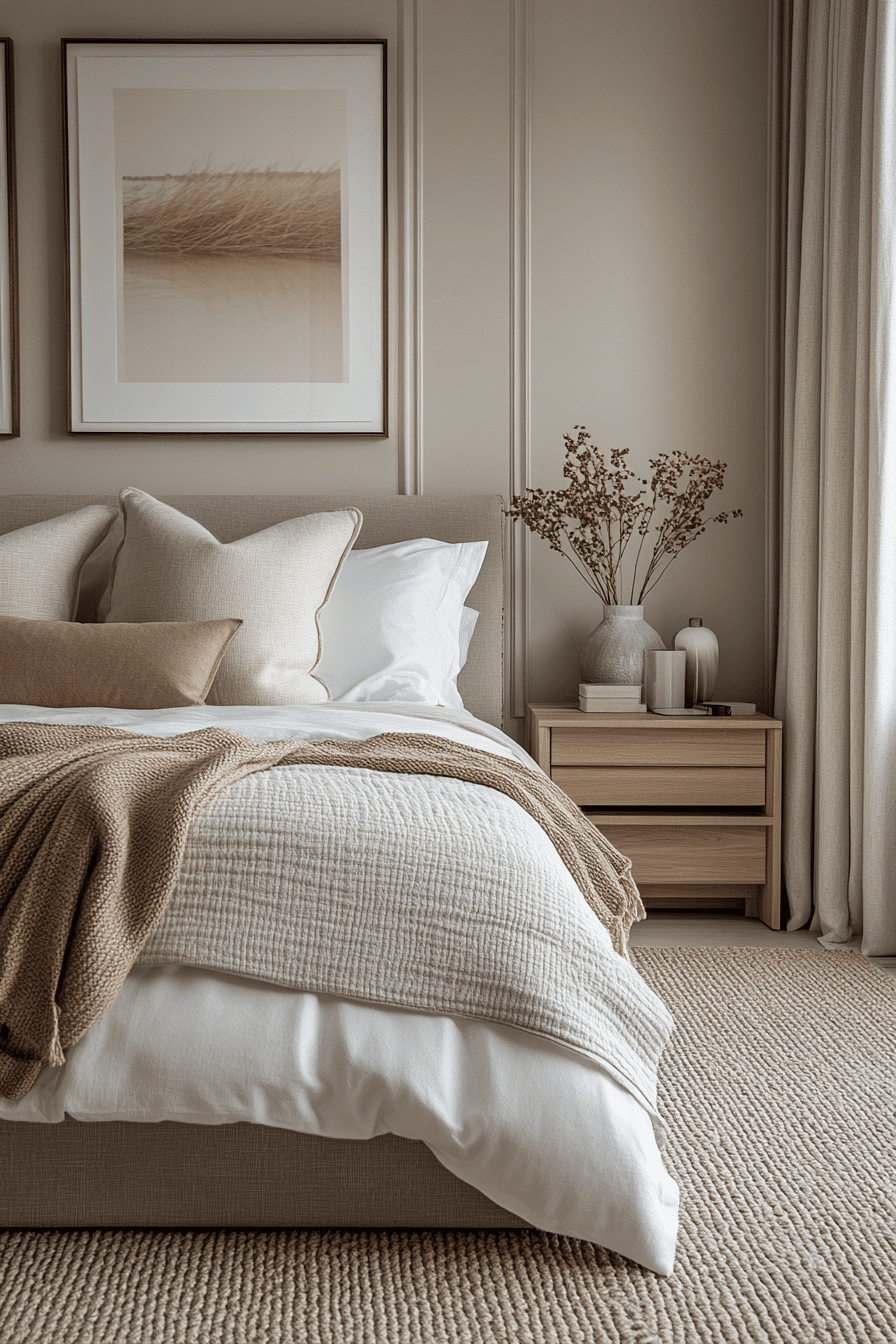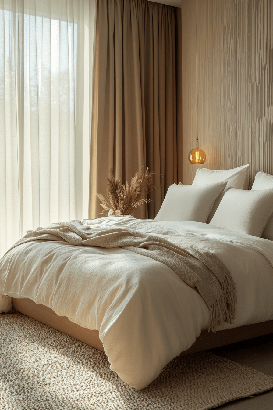 Soft, warm tones can turn a modern bedroom interior into a soothing escape that feels peaceful and grounded. Shades like beige, taupe, and cream create a gentle, welcoming base. Natural wood furniture adds warmth while maintaining a clean, modern look. Layered bedding and subtle patterns bring in comfort and depth. Light fabrics and soft rugs complete the relaxed atmosphere. Click to explore more modern bedroom interior ideas with warm neutral tones.