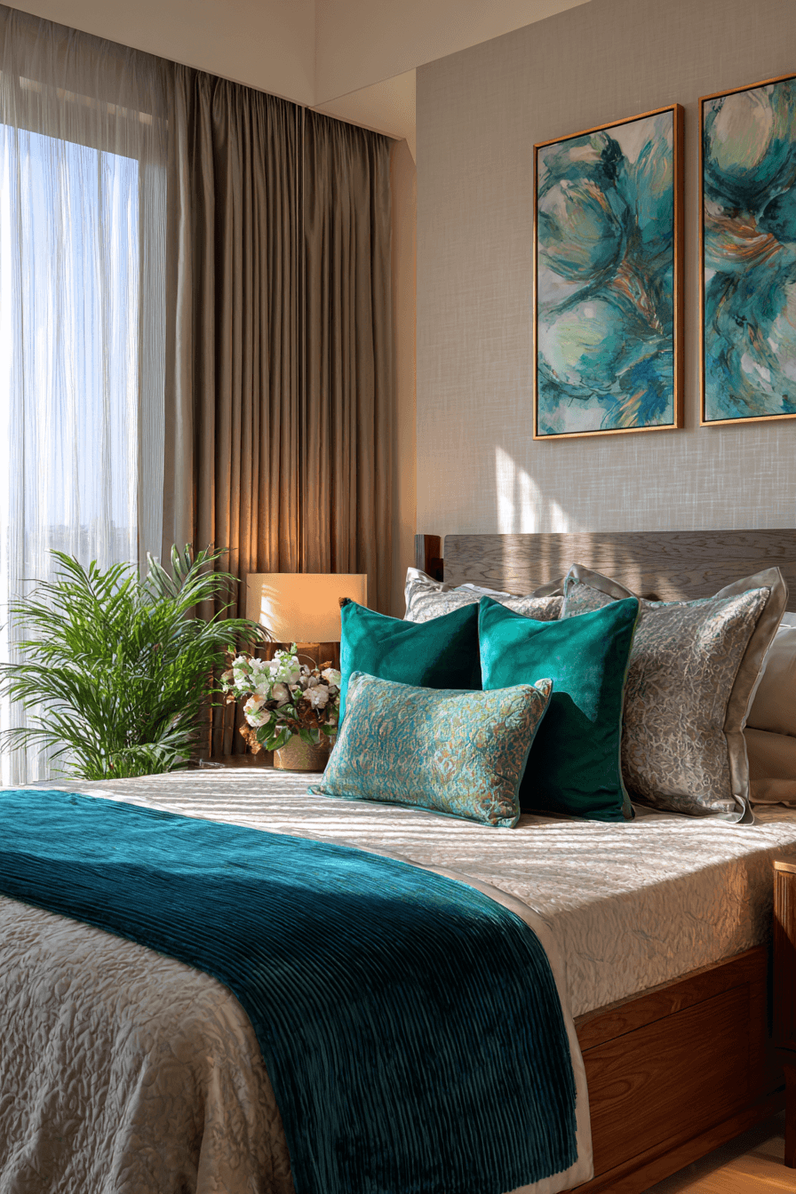 A thoughtful mix of bold and subtle hues can make a modern bedroom interior feel vibrant, fresh, and full of personality. Jewel tones like emerald or sapphire pop beautifully against soft neutrals. Color-blocked accents and layered textiles add interest without cluttering the space. Clean furniture lines keep the overall look modern and balanced. Coordinated artwork ties the palette together for a polished finish. Tap to uncover more modern bedroom interior ideas with creative color combinations.