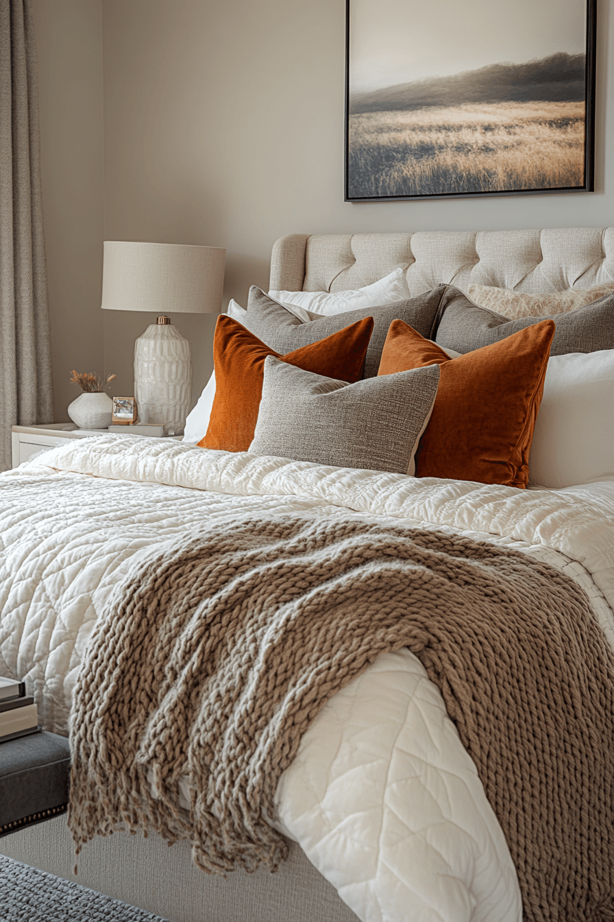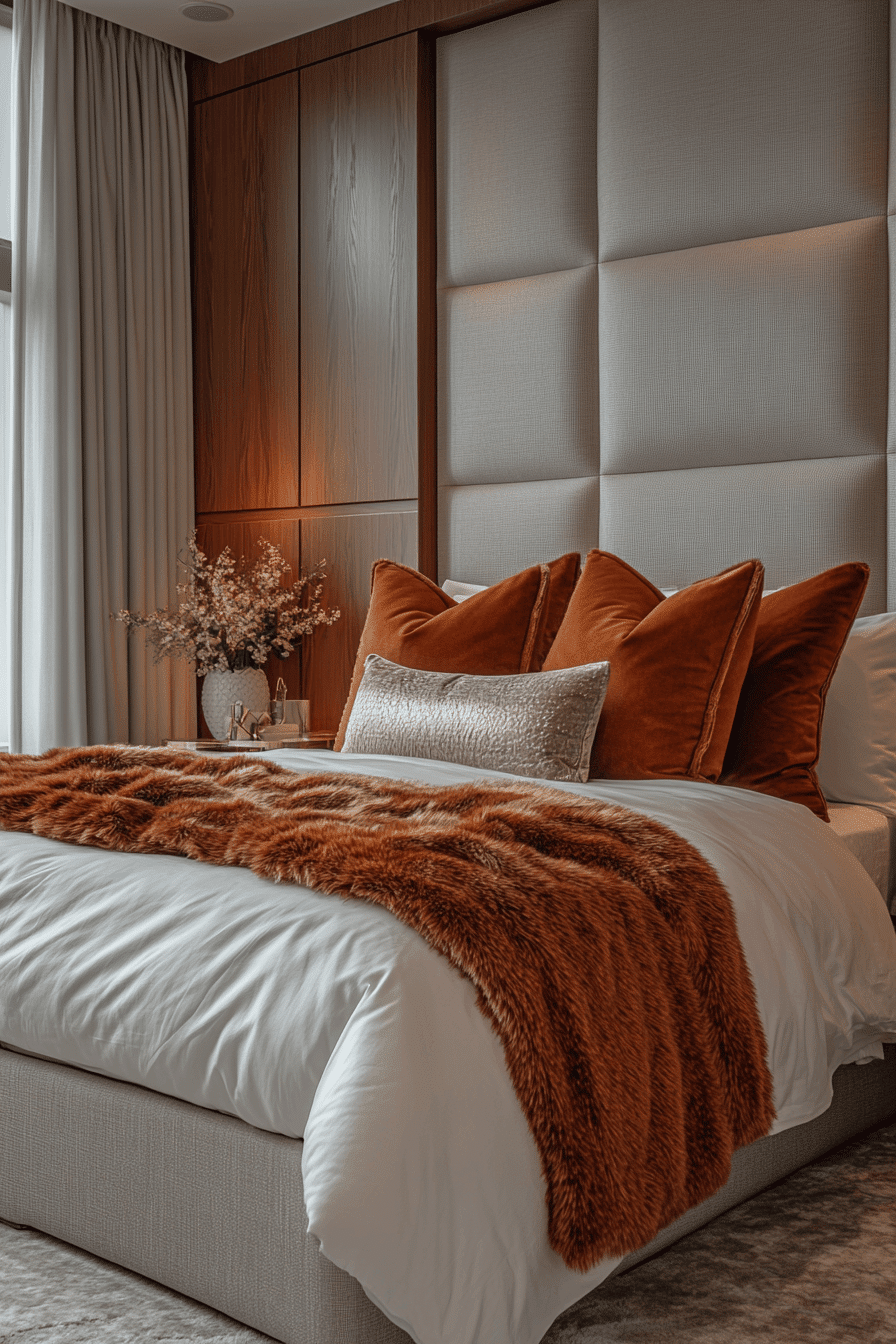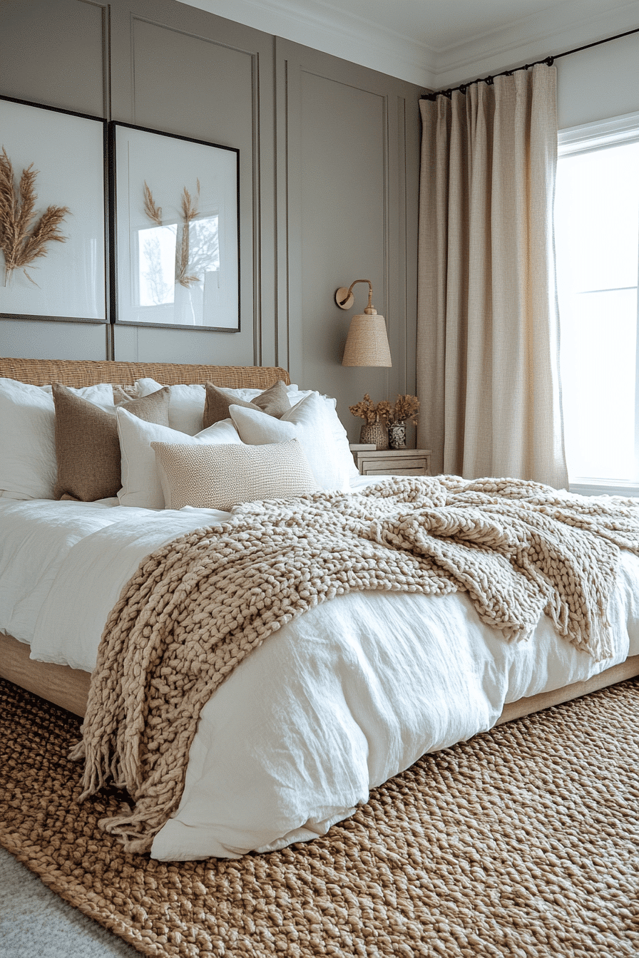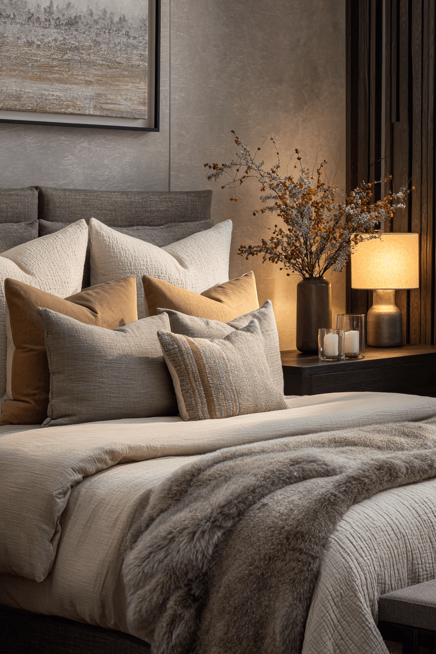 Layered textiles can bring instant warmth and character into a modern bedroom interior while keeping the look clean and elevated. A bed styled with cozy throws, quilts, and plush pillows feels inviting and full of dimension. Soft neutral tones ensure the palette stays versatile and easy to refresh over time. Sleek nightstands and minimalist lighting add structure without taking away from the comfort. Subtle wall accents tie everything together in a polished way. Tap to explore more modern bedroom interior ideas with cozy layered styling.