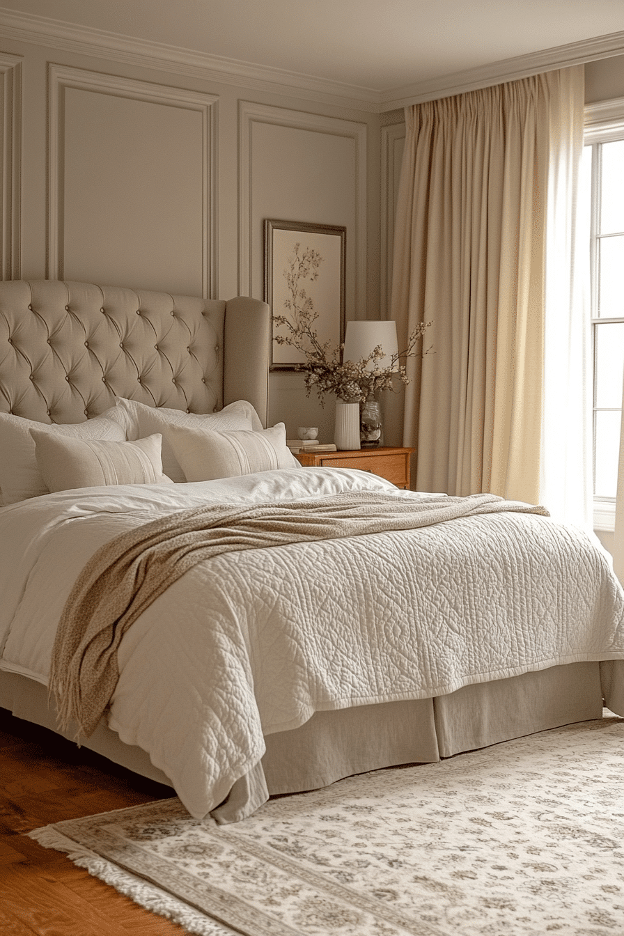 Soft neutrals can shape a modern bedroom interior into a space that feels warm, balanced, and timeless. Shades of beige, cream, and gray create a soothing backdrop that feels cozy yet elevated. Layered textiles like linen curtains, quilted bedding, and plush rugs add depth and comfort. A subtle statement headboard brings in just the right amount of sophistication. Natural light enhances the textures, making the room feel open and inviting. Click to discover more modern bedroom interior ideas with neutral elegance.