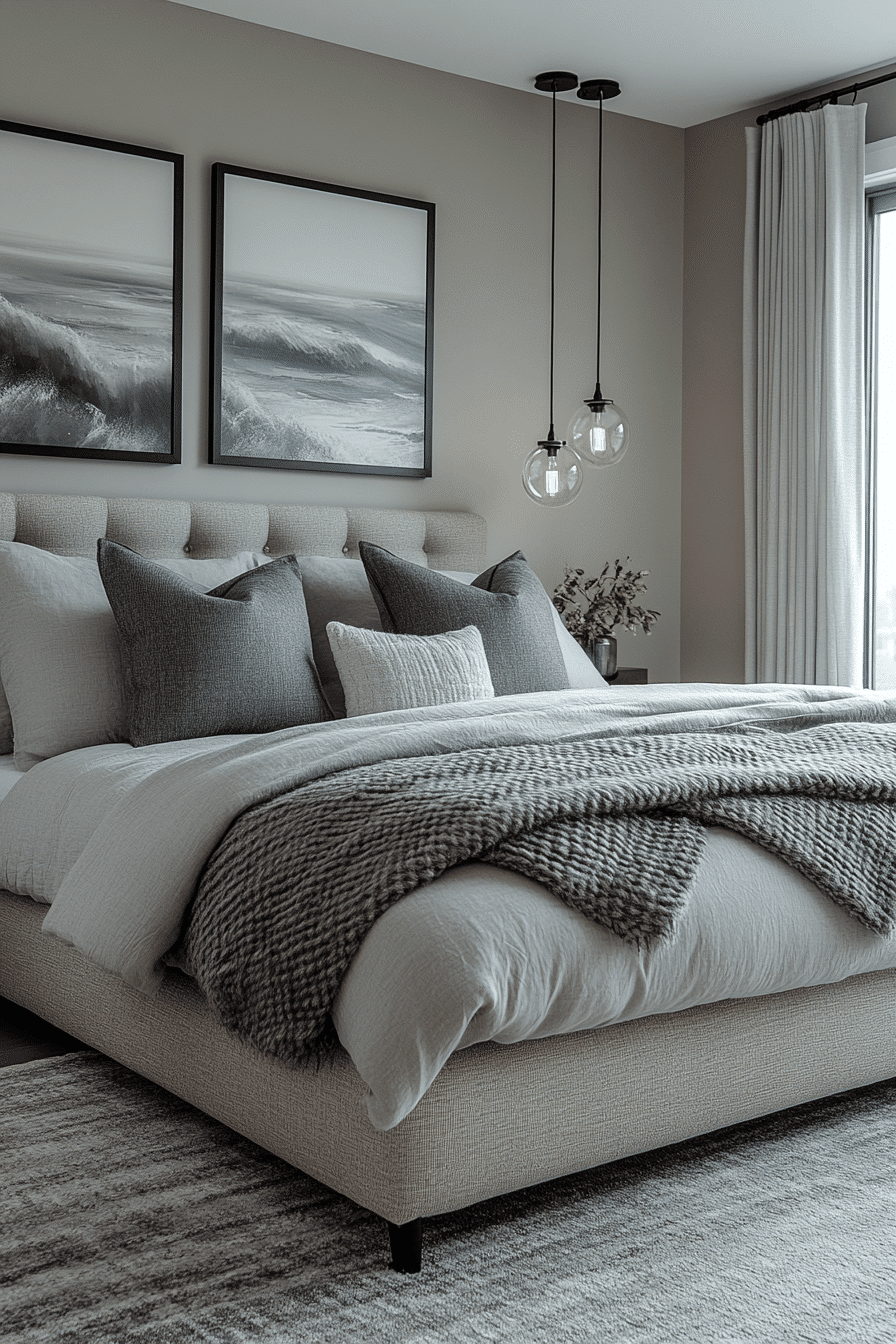 A tonal palette can give a modern bedroom interior a refined, layered look that feels both calm and elevated. Different shades of gray create depth while maintaining a cohesive style. Minimal furniture keeps the space structured and visually clean. Textured elements like rugs or wall finishes add comfort without breaking the color flow. A statement light fixture brings everything together with a modern edge. Click to explore more modern bedroom interior ideas with monochrome elegance.