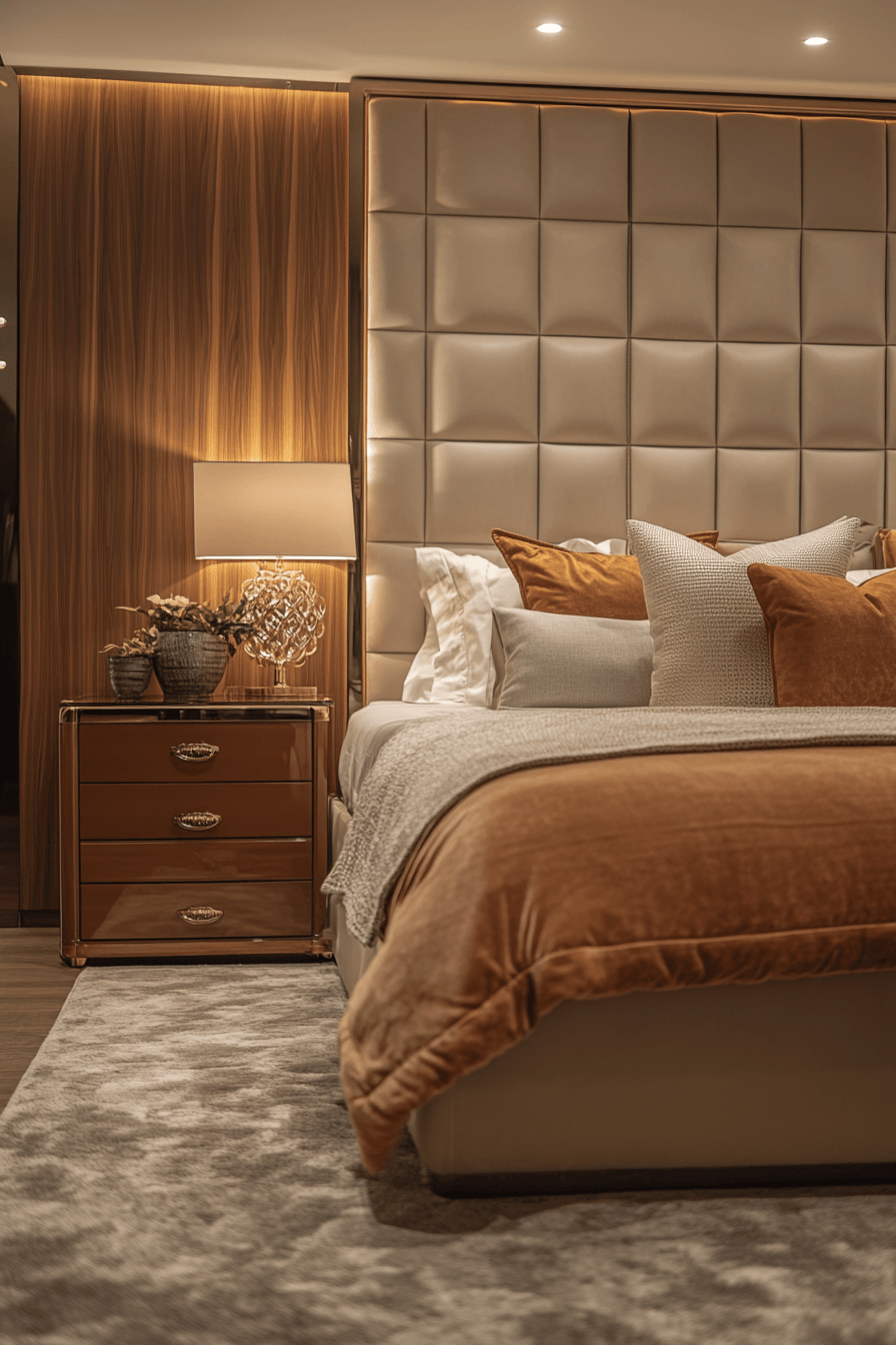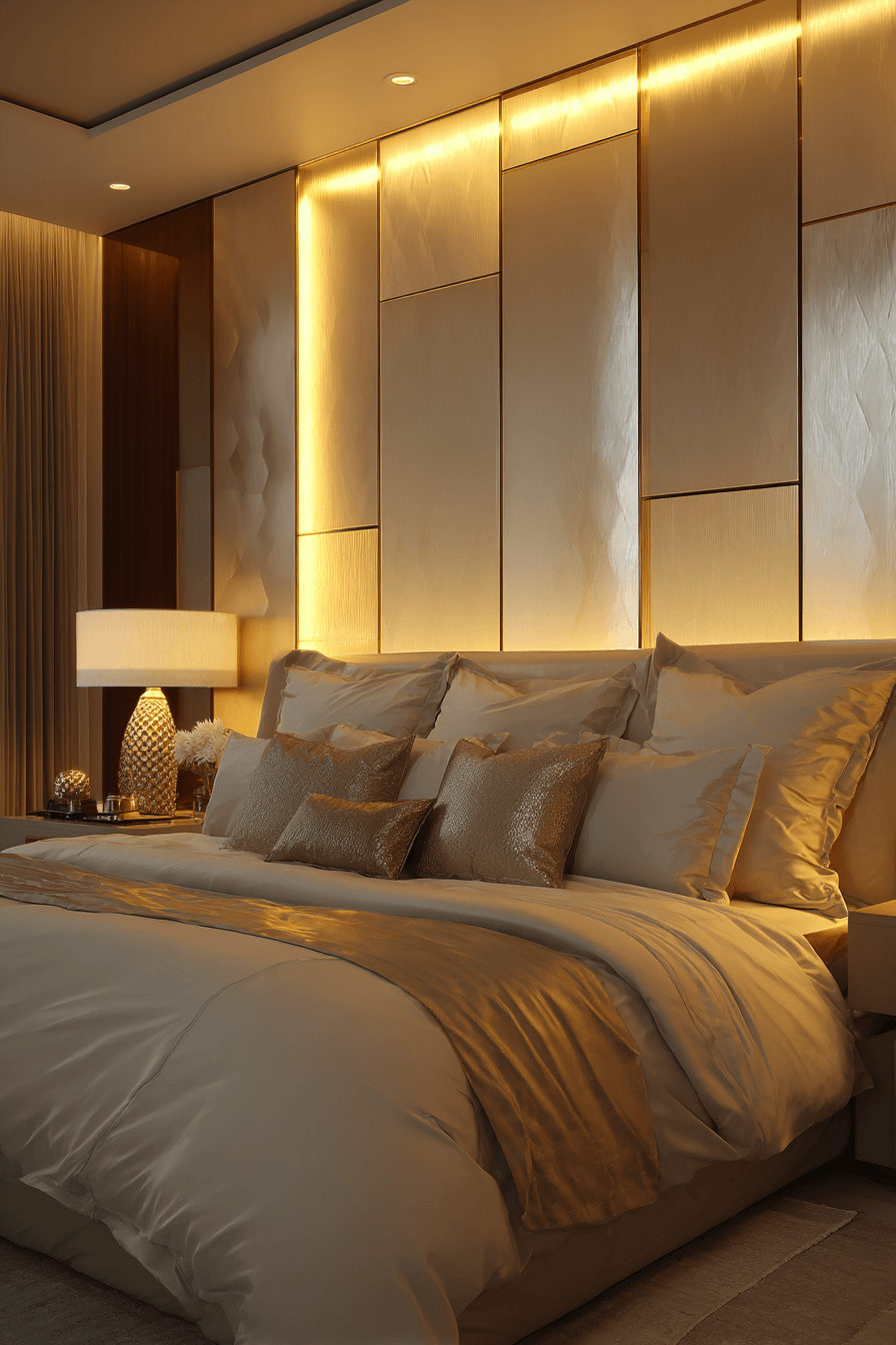 A polished, hotel-like atmosphere can transform a modern bedroom interior into a luxurious everyday retreat. Plush bedding layered with pillows and throws creates an inviting, indulgent feel. An upholstered headboard paired with metallic accents adds a refined touch. Neutral walls keep the space calm and effortlessly elegant. Layered lighting mimics the cozy glow of upscale suites. Tap to uncover more modern bedroom interior ideas inspired by hotel luxury.
