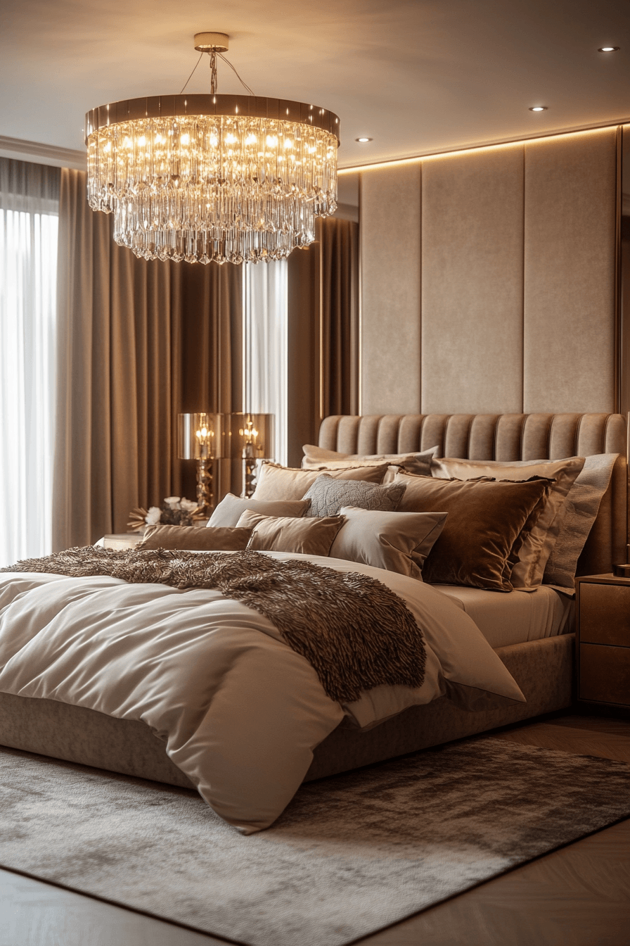 Luxurious textures can elevate a modern bedroom interior into a space that feels indulgent yet functional. Velvet, satin, and metallic finishes add richness while maintaining a clean aesthetic. A statement light fixture creates a focal point and enhances the upscale vibe. Warm neutral walls keep everything grounded and balanced. Reflective surfaces help bounce light and make the room feel more spacious. Tap to discover more modern bedroom interior ideas with a luxe feel.