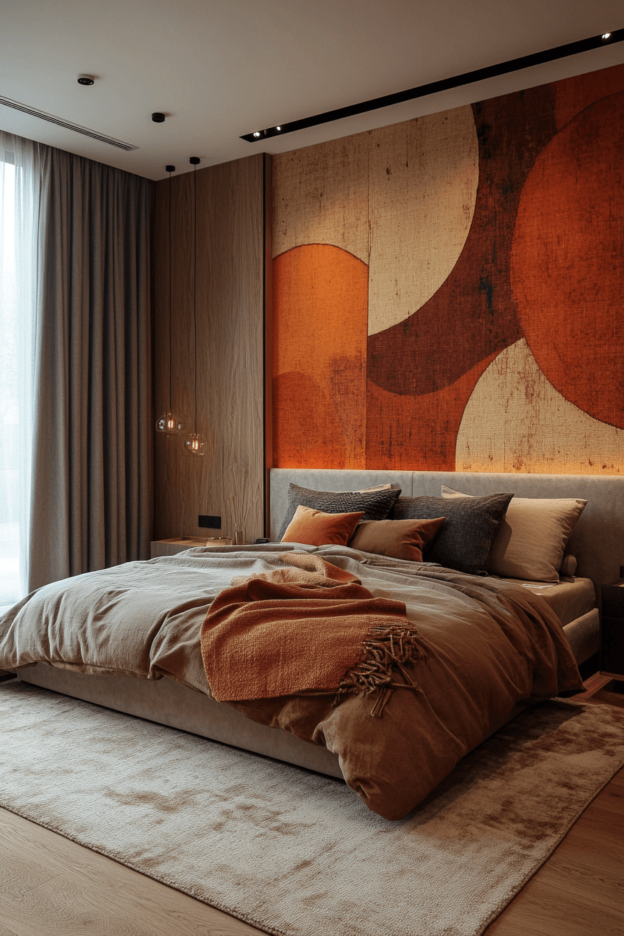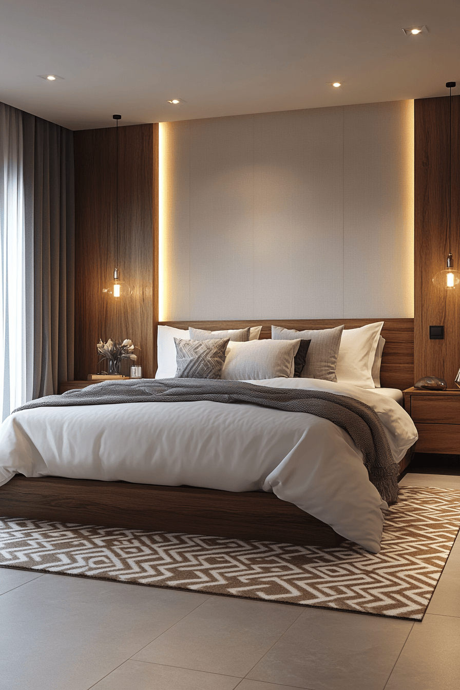 Dynamic patterns can bring energy and personality into a modern bedroom interior while keeping the overall look fresh. Geometric designs on rugs, bedding, or accent walls create movement and visual interest. Neutral furniture tones help ground the space so it never feels overwhelming. A limited palette keeps everything cohesive while letting the patterns stand out. Soft lighting adds balance, blending boldness with comfort. Click to explore more modern bedroom interior ideas with geometric flair.