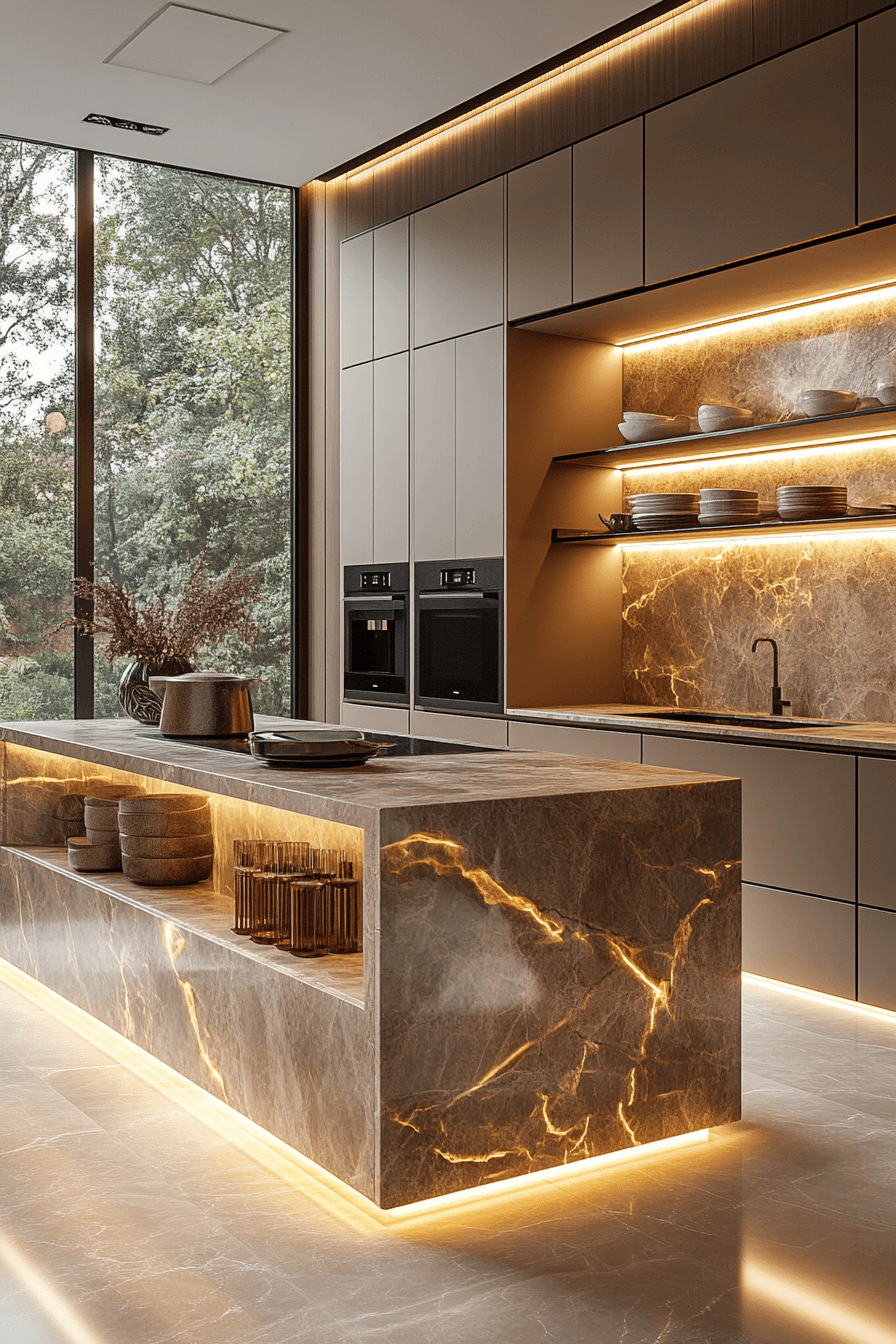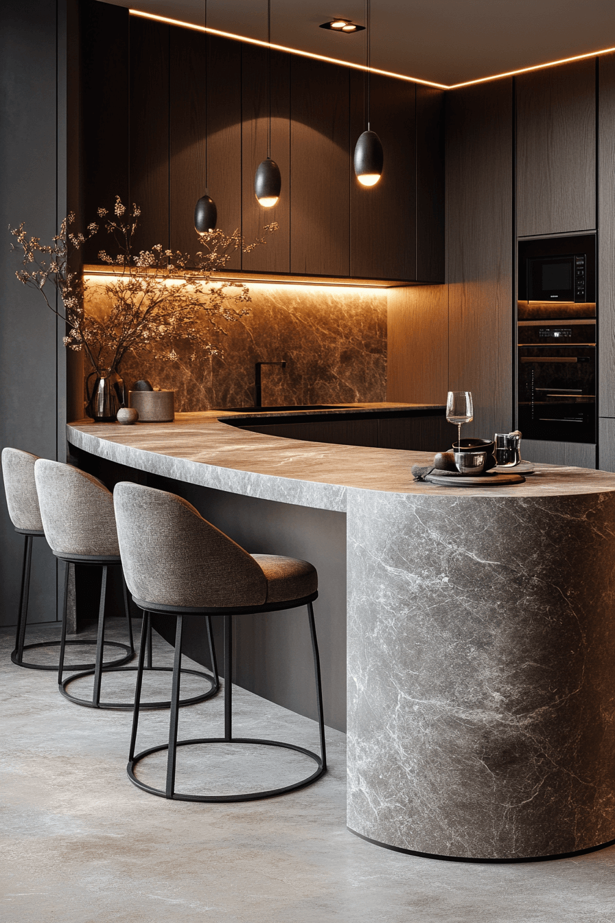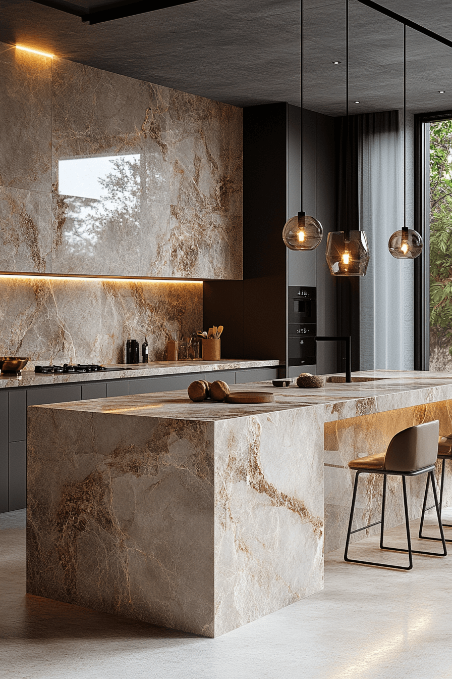 Soft stone tones wrap this modern luxury kitchen in a plush, welcoming atmosphere. Pale countertops and gently veined backsplashes feel rich yet still clean and contemporary. A generous island doubles as a lounge area, with cozy seating and warm lighting that invite lingering. Minimal hardware and integrated pulls keep every surface looking smooth and uninterrupted. This modern luxury kitchen blurs the line between cooking zone and relaxing hangout. Tap to see how a soft stone culinary lounge look can bring comfort and elegance to your home.