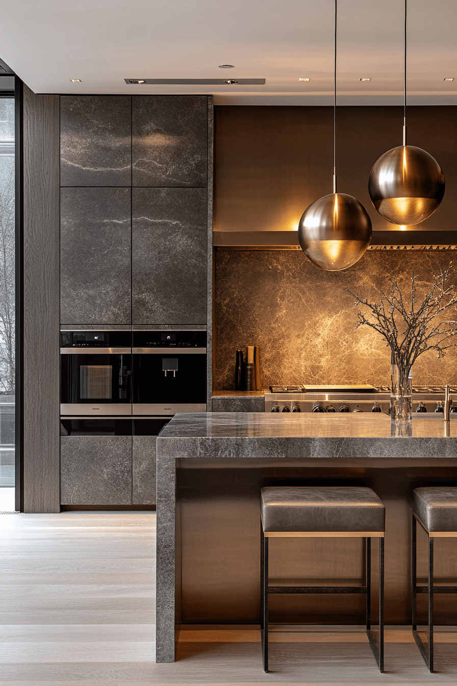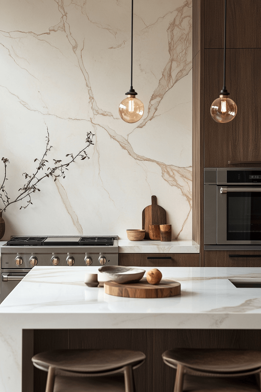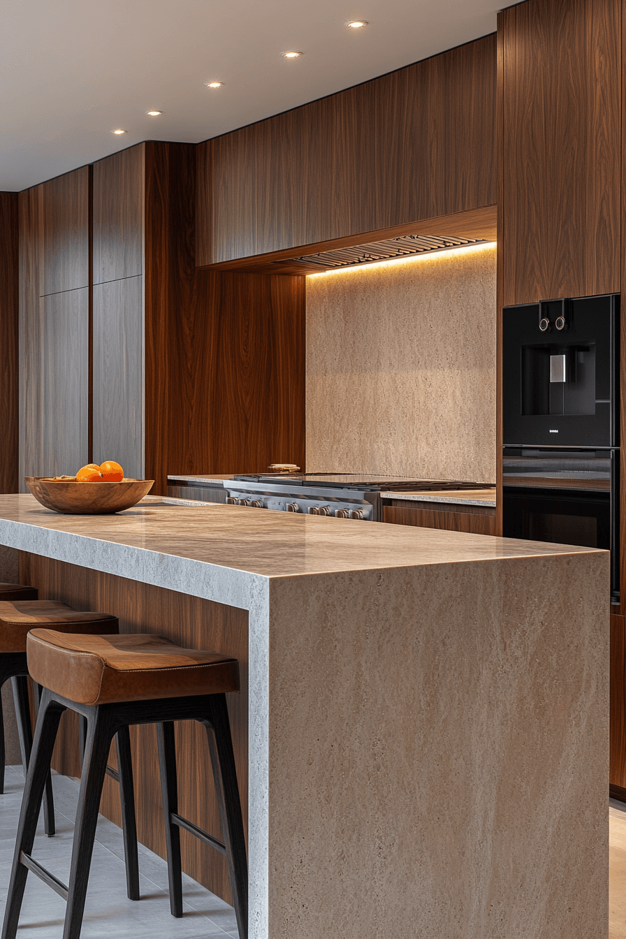 Soft stone tones wrap this modern luxury kitchen in a plush, welcoming atmosphere. Pale countertops and gently veined backsplashes feel rich yet still clean and contemporary. A generous island doubles as a lounge area, with cozy seating and warm lighting that invite lingering. Minimal hardware and integrated pulls keep every surface looking smooth and uninterrupted. This modern luxury kitchen blurs the line between cooking zone and relaxing hangout. Tap to see how a soft stone culinary lounge look can bring comfort and elegance to your home.
