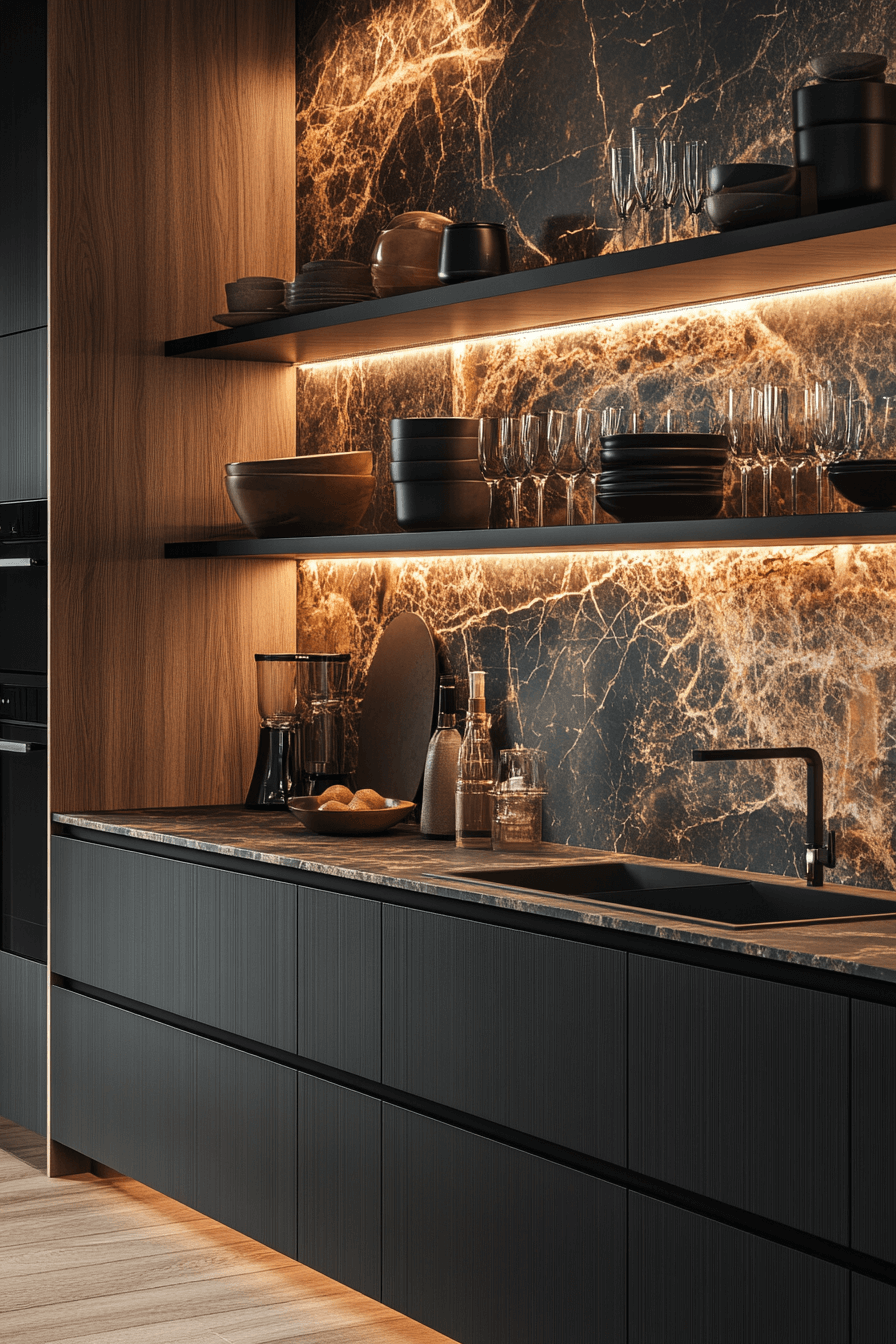 Matte black cabinetry and fixtures instantly set a bold, upscale tone in this modern luxury kitchen. The dark finish absorbs light in a way that feels dramatic and refined, especially alongside pale stone counters and warm wood details. Open shelving and industrial-style lighting bring in just enough loft character while keeping the design clean. High-end appliances hidden behind paneling ensure everything feels cohesive and streamlined. This modern luxury kitchen balances edgy attitude with timeless elegance. Tap to explore how a matte black chef’s loft style could transform your cooking space.