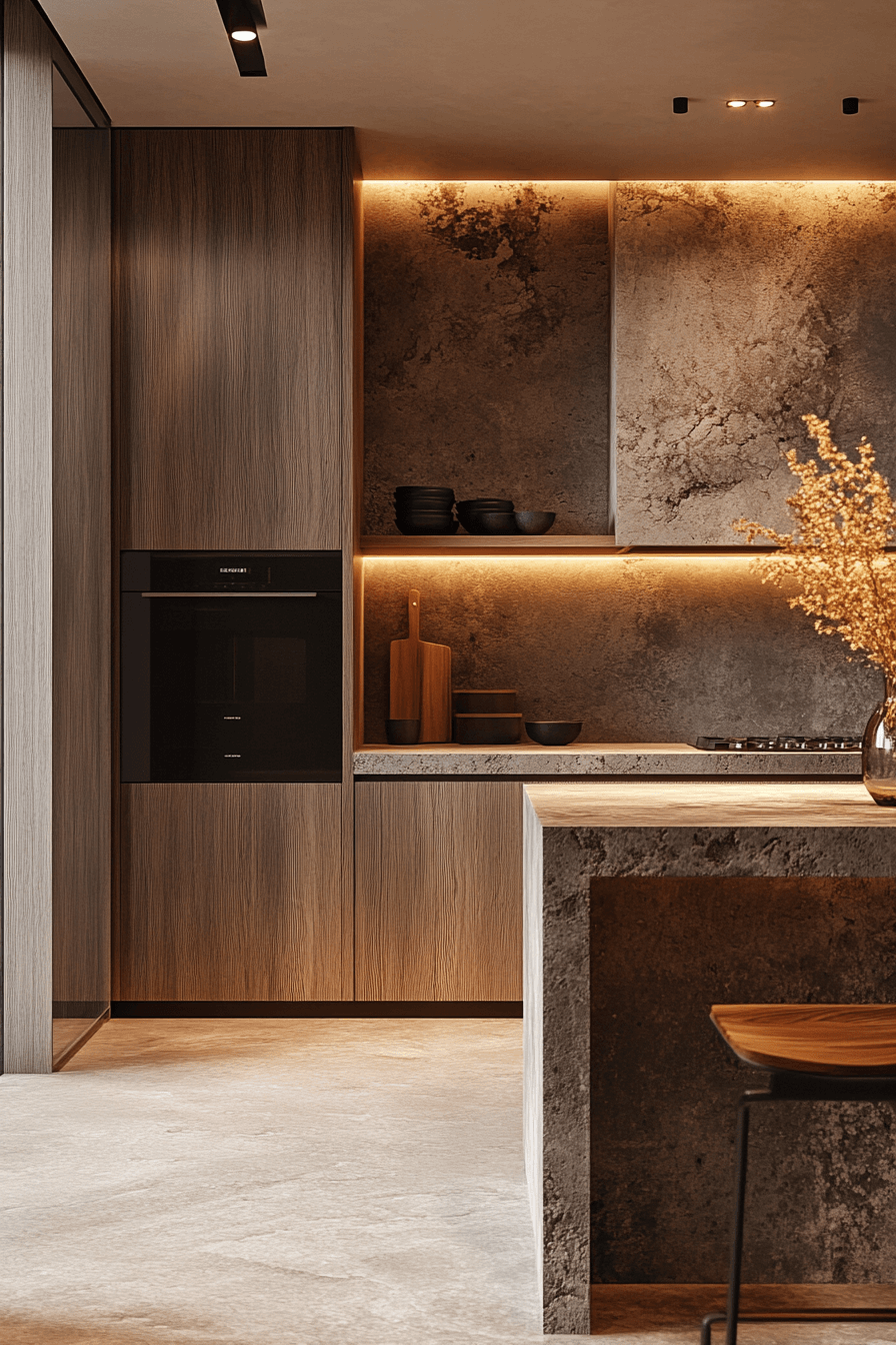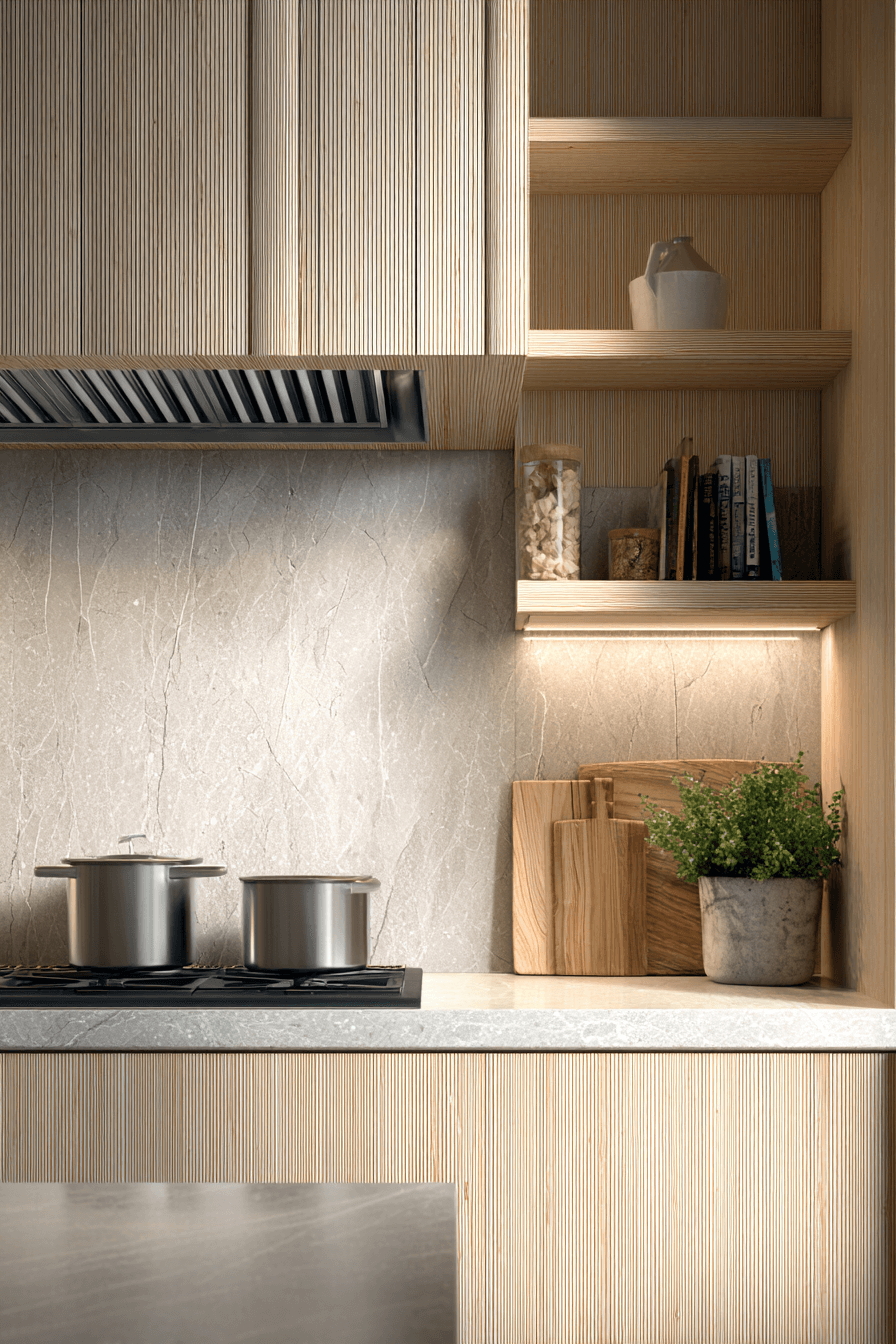 Textured wood cabinetry adds warmth and tactile interest to the sleek lines of this modern luxury kitchen. Vertical grain, fluting, or subtle paneling brings depth without tipping into rustic or busy. Matte stone counters and minimalist hardware keep the look grounded and contemporary. Carefully placed task lighting makes the space feel like a professional chef’s lab while still being inviting. This modern luxury kitchen thrives on the contrast between natural texture and precise design. Tap to see how a textured wood chef’s lab style can make your kitchen feel both sophisticated and cozy.