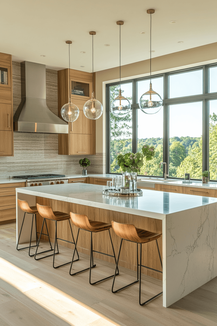 A large, beautifully framed window becomes the star of this modern luxury kitchen, flooding the space with natural light. The cabinetry and layout are intentionally arranged to draw the eye toward the view outside. A simple island and understated finishes keep the focus on the scenery rather than the fixtures. Light woods, soft stone, and minimal hardware echo the airy, open vibe. This modern luxury kitchen treats the view as a key design material. Tap to see how a framed-window kitchen can make your space feel expansive and inspiring.