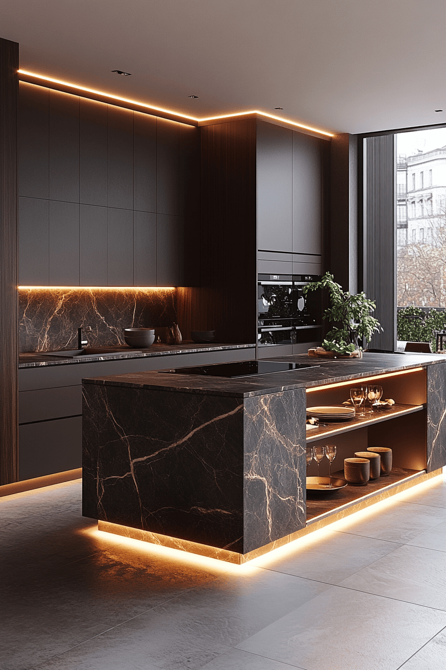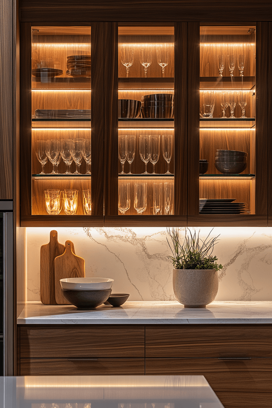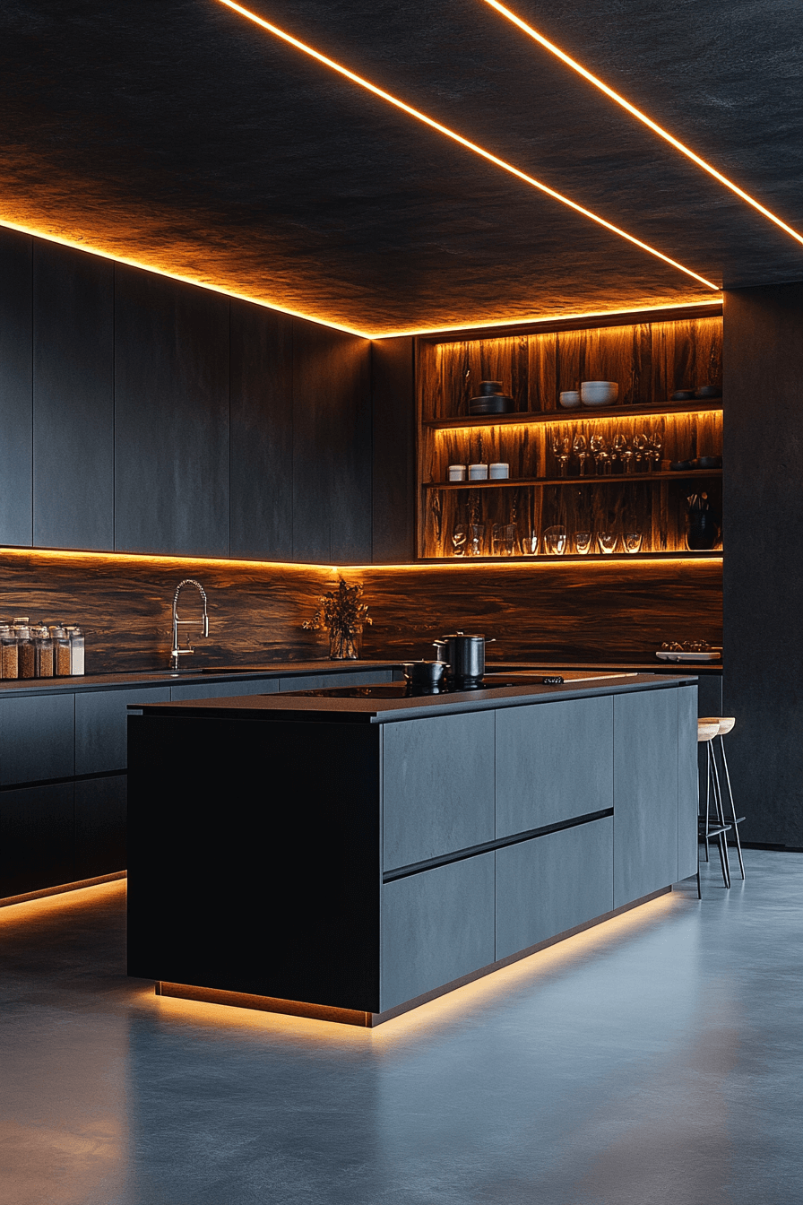 Backlit niches and shelves bring depth and drama to this modern luxury kitchen, spotlighting special bottles, art, or decor. The gentle glow adds ambiance and draws attention to the architecture without overwhelming the room. Clean cabinetry and a streamlined island ensure the illuminated recesses stay center stage. Premium materials and top-tier appliances keep the rest of the space equally refined. This modern luxury kitchen layers functional lighting with mood-setting design. Click to explore how a backlit niche concept can add a warm, sophisticated glow to your home.