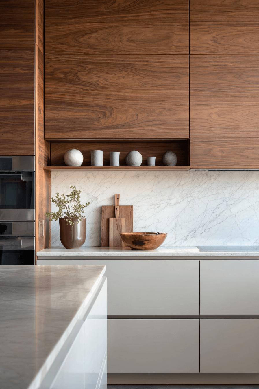 Matte porcelain surfaces on countertops, backsplashes, and even fronts give this modern luxury kitchen a refined, velvety look. The material feels sleek and sophisticated while offering impressive durability and easy maintenance. Paired with minimalist cabinetry and pro-level appliances, it creates a true chef’s environment. Neutral tones and delicate veining keep the space calm, elegant, and cohesive. This modern luxury kitchen marries practical performance with a high-end aesthetic. Click to discover how a matte porcelain chef’s space can elevate your everyday cooking.