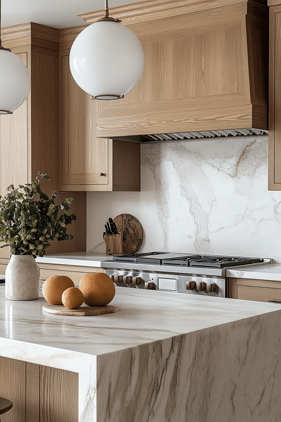 Pale oak cabinetry and accents bathe this modern luxury kitchen in light, warmth, and natural charm. The soft wood tones pair beautifully with marble or quartz counters and subtle metal touches. A spacious island and comfortable seating invites guests to linger and chat. Understated lighting and integrated appliances keep the spotlight on the airy materials. This modern luxury kitchen blends a welcoming feel with crisp, contemporary lines. Tap to see how a pale oak entertainer’s zone can become the heart of your home.