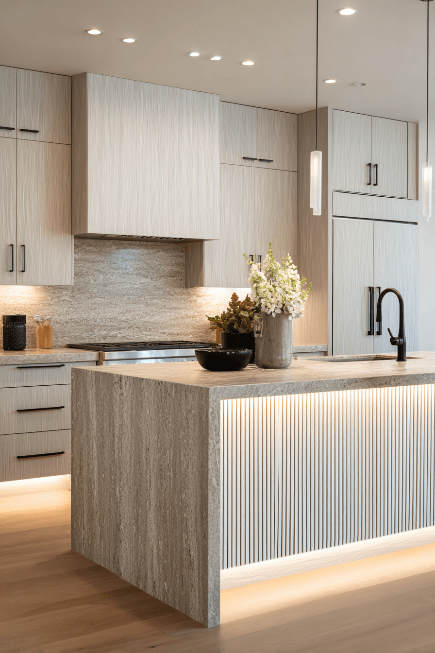 Fluted or ribbed panels on the island, cabinets, or hood add subtle movement and texture to this modern luxury kitchen. The vertical lines bring depth and character while staying refined and minimal. Smooth countertops and sleek fixtures balance the texture so the overall composition feels harmonious. Warm, gentle lighting grazes the flutes and creates a cozy glow. This modern luxury kitchen introduces personality without sacrificing clean lines. Click to discover how a fluted-panel chef’s retreat can make your kitchen feel unique and elevated.