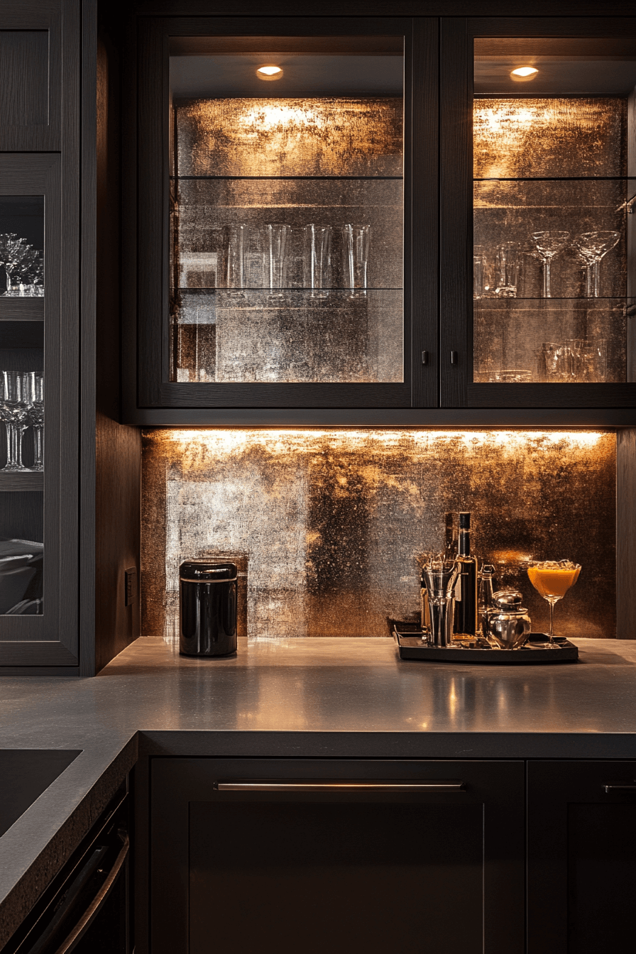 A smoky mirror backsplash adds depth, light, and a hint of drama to this modern luxury kitchen. The tinted reflection visually enlarges the room while softening the mirrored effect for a more refined feel. Paired with simple cabinetry and stone countertops, the backsplash becomes a chic focal point. Under-cabinet lighting makes the surface shimmer gently without feeling flashy. This modern luxury kitchen uses reflection in a subtle, fashion-forward way. Tap to see how a smoky mirror backsplash can instantly elevate your space.