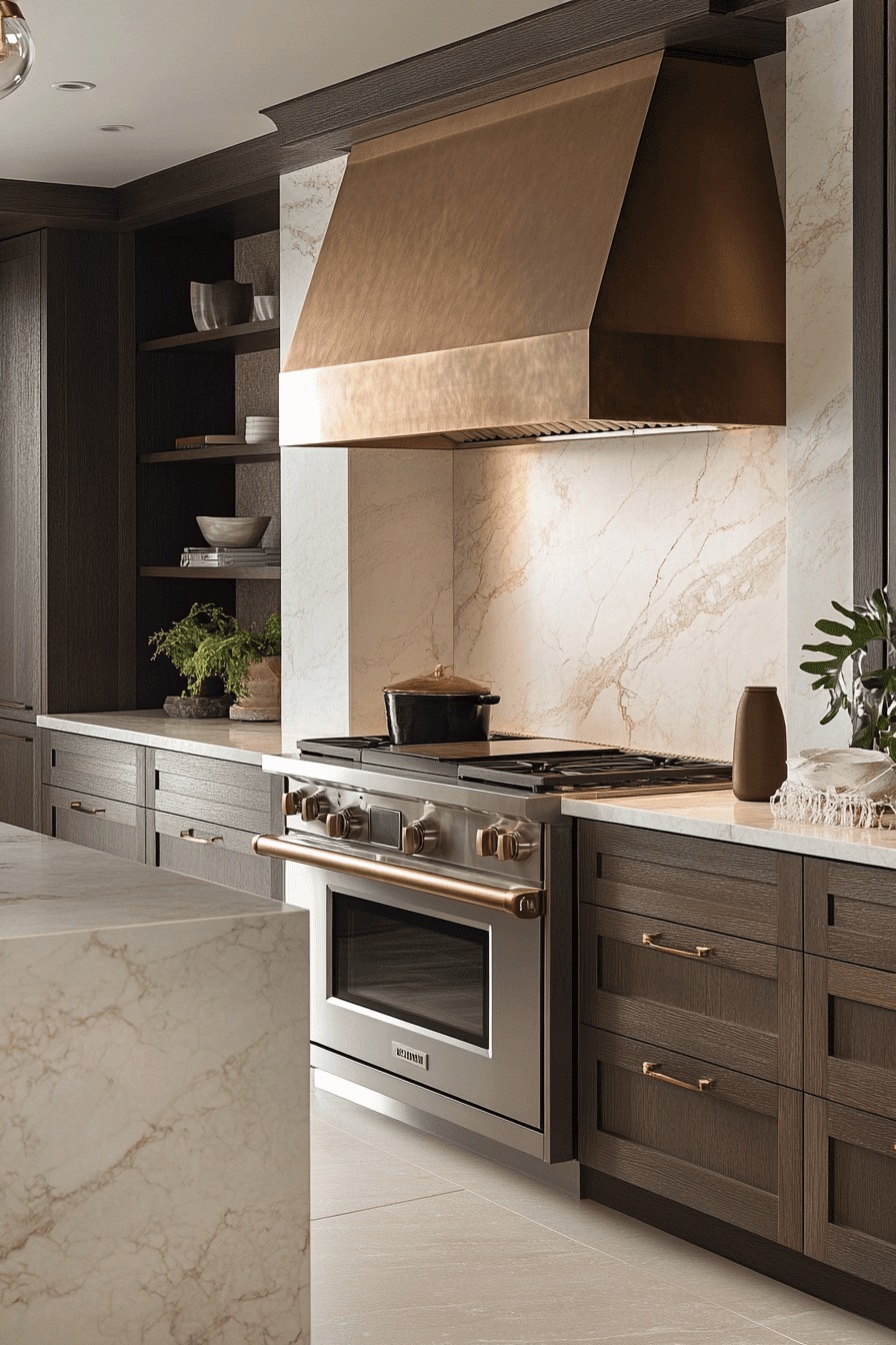By tucking the hood into cabinetry or the wall, this modern luxury kitchen achieves an uninterrupted, streamlined profile. The integrated hood allows the backsplash or wall material to read as one continuous surface. Simple hardware, sleek lines, and flush-front cabinets keep distractions to a minimum. High-end appliances support the polished look and complete the cohesive design. This modern luxury kitchen turns a necessary element into a seamless part of the architecture. Click to explore how a concealed hood can refine your kitchen’s overall feel.