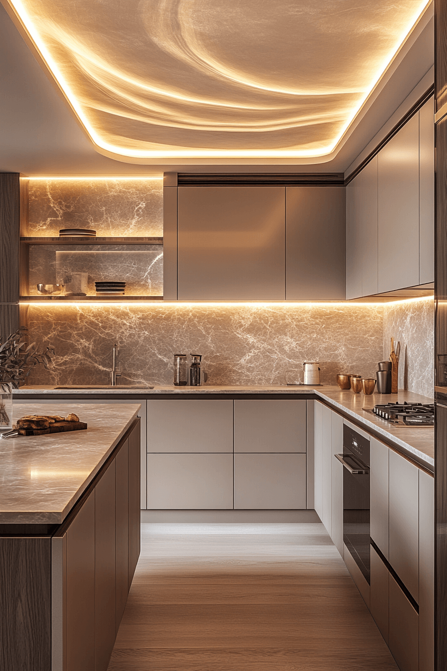A softly lit or cove-lit ceiling creates a gentle, glowing canopy over this modern luxury kitchen. The light washes down over cabinets, countertops, and the island, giving everything a warm, polished sheen. Clean-lined cabinetry and a neutral palette keep the look serene and sophisticated. The illuminated ceiling adds height and drama without overpowering the rest of the design. This modern luxury kitchen shows how lighting can double as architecture. Tap to see how a luminous ceiling could add a high-end glow to your space.