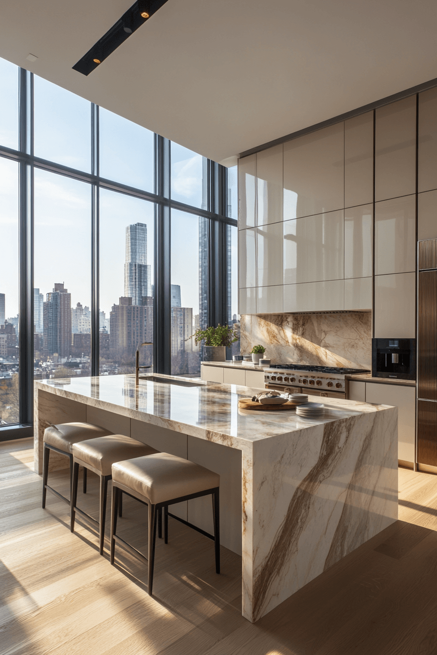 Floor-to-ceiling windows, sleek cabinetry, and a streamlined island give this modern luxury kitchen a high-rise, penthouse feel. Clean lines and integrated appliances keep the space visually quiet so the architecture and views can shine. Soft neutrals, warm wood, and understated metallics create a refined yet welcoming backdrop. A set of sculptural pendant lights over the island adds a sophisticated focal point without competing with the skyline. This modern luxury kitchen beautifully blends city polish with everyday ease. Click to see how an urban-inspired penthouse kitchen look could elevate your home.