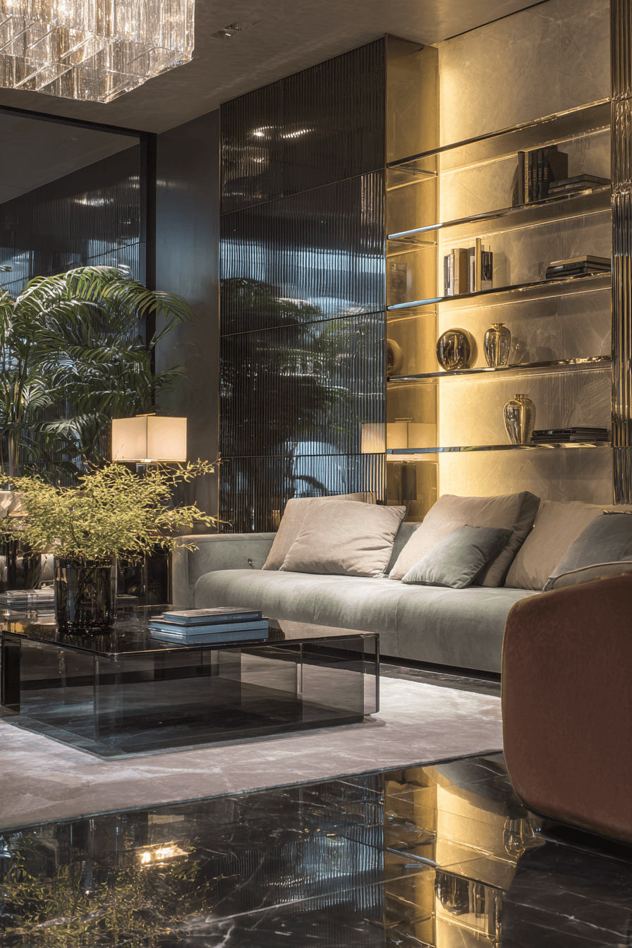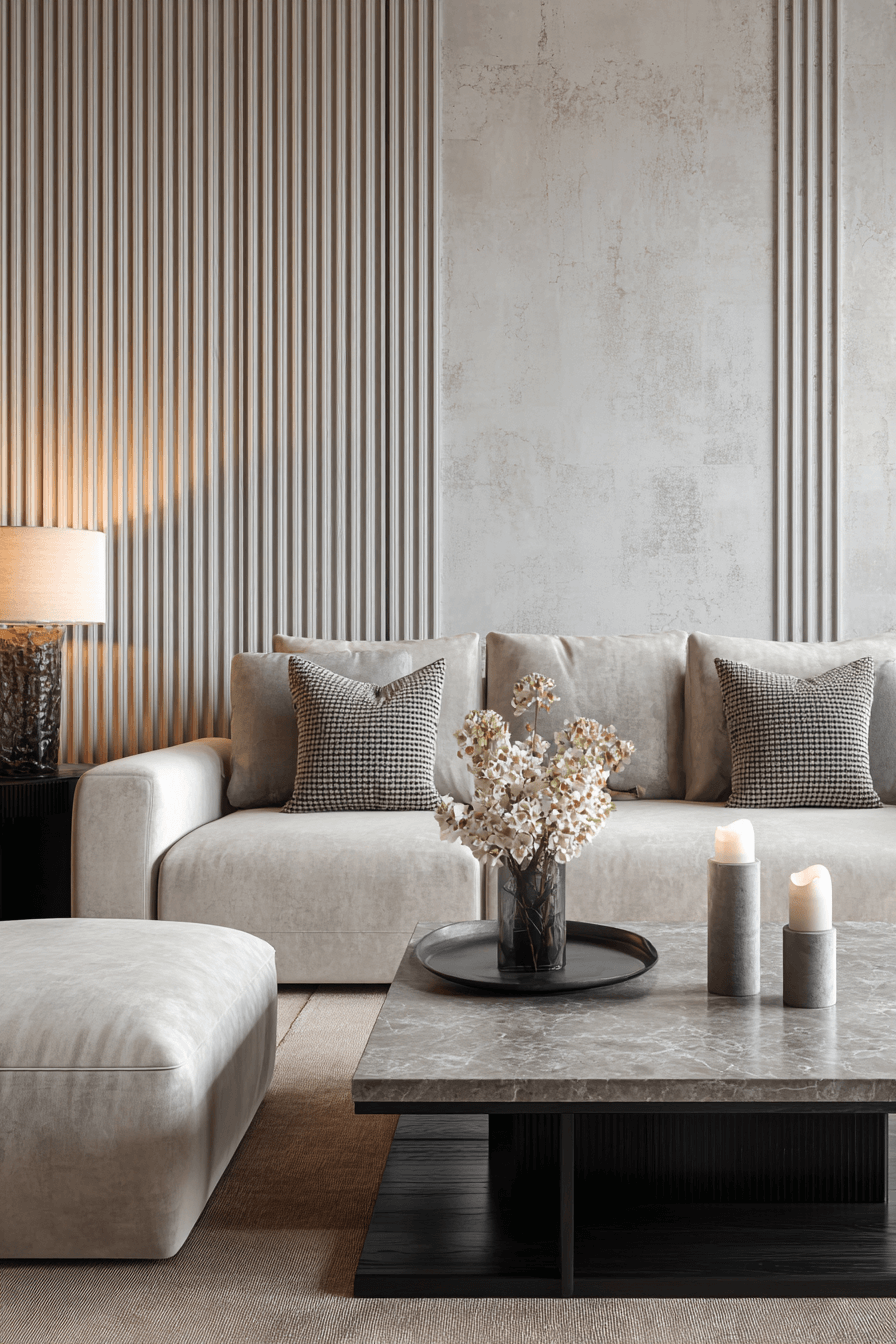 Fluted wall panels or cabinetry add subtle texture to this modern luxury living room. The vertical lines create movement while maintaining a clean, modern profile. Soft lighting enhances the depth of the fluting. Plush seating and neutral tones balance the texture with comfort. This concept works beautifully in a modern luxury living room because it introduces detail without clutter. Tap to explore how fluted panels can refine your design.