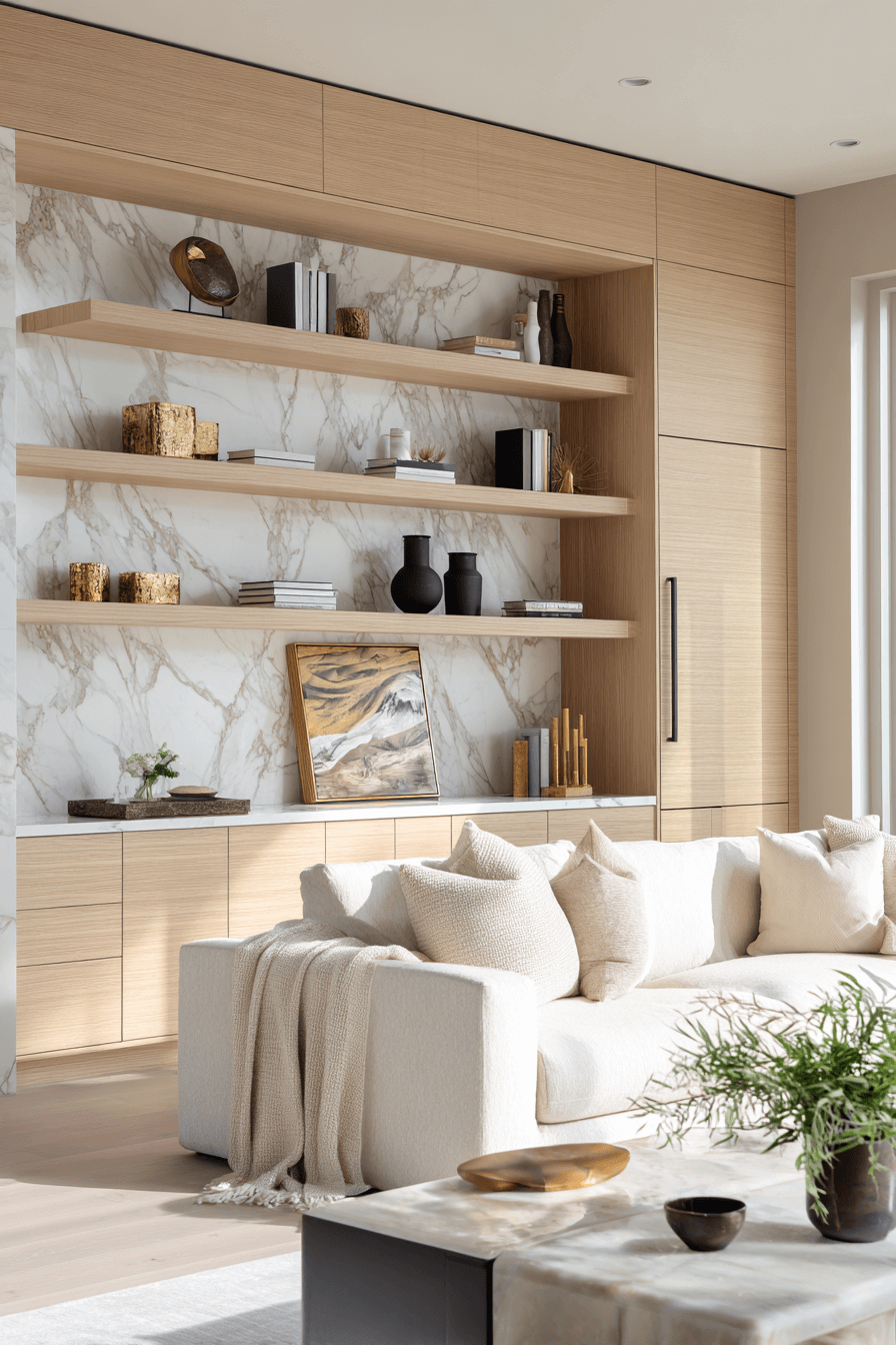 Pale oak cabinetry and furniture pieces give this modern luxury living room a light, natural warmth. The soft wood tones balance beautifully with marble, linen, and matte metals. Open shelving can showcase curated art and decor for a gallery-inspired feel. Clean lines ensure the wood remains contemporary rather than rustic. This design flourishes in a modern luxury living room because it blends natural materials with upscale finishes. Click to get inspired by the pale oak living gallery aesthetic.
