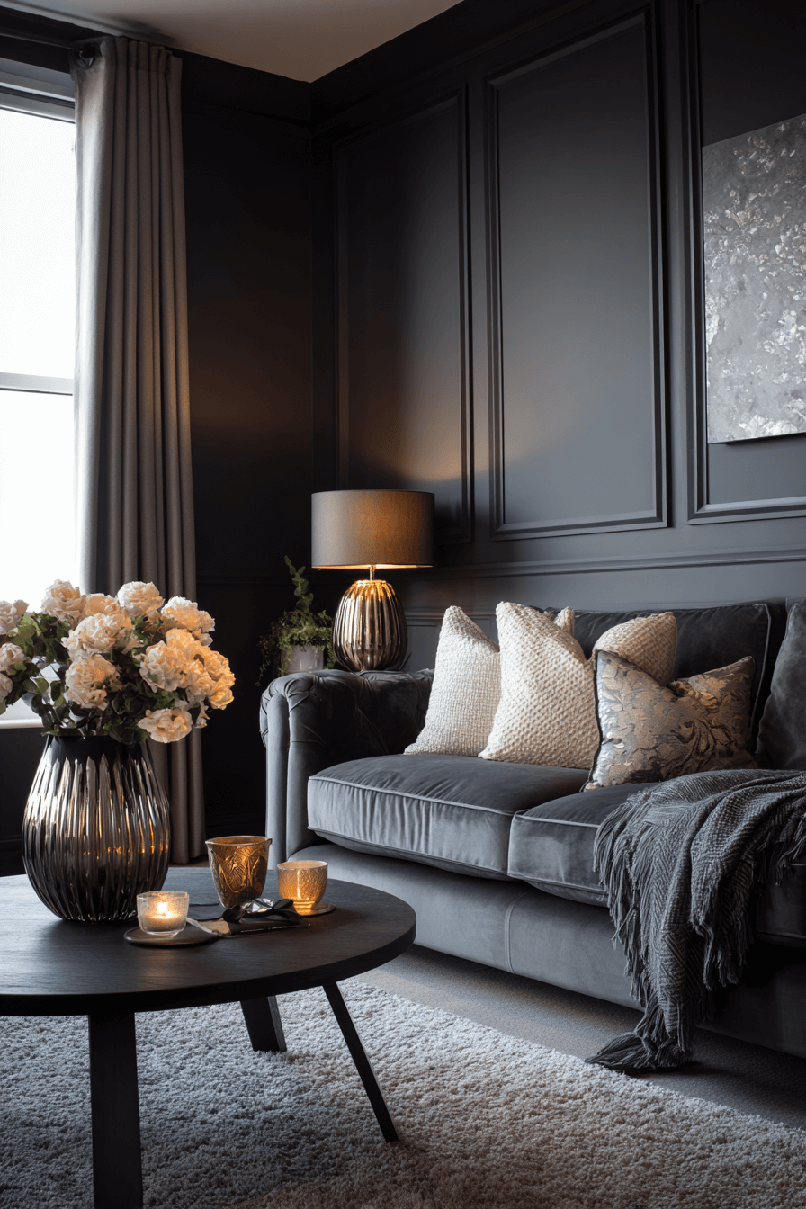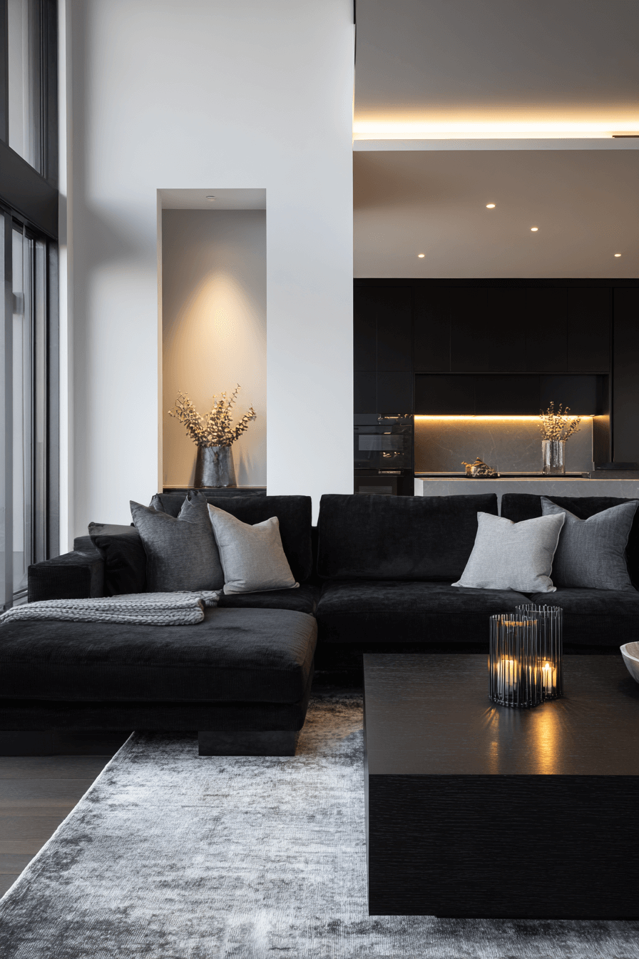 Deep matte charcoal walls create a dramatic yet cozy setting in this modern luxury living room. Light-colored furniture and metallic accents provide contrast and balance. Plush rugs and layered textiles prevent the dark tones from feeling heavy. Thoughtful lighting keeps the space inviting and elegant. This approach works in a modern luxury living room because it merges boldness with warmth. Tap to discover how charcoal tones can elevate your living space.