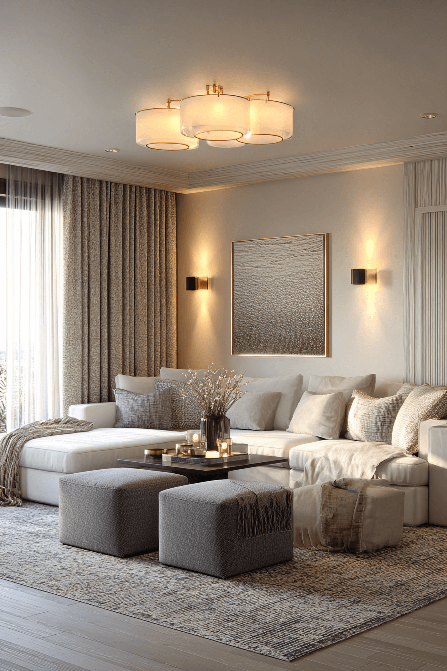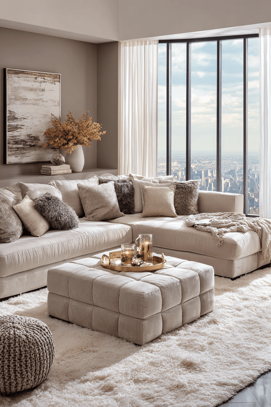 This modern luxury living room is wrapped in warm taupe tones that feel inviting and elegant. A generous sectional and oversized ottoman make entertaining effortless. Layered lighting and plush rugs enhance the cozy atmosphere. Subtle metallic or glass accents add just the right amount of polish. It succeeds as a modern luxury living room because it feels welcoming without sacrificing sophistication. Click to see how warm taupe can elevate your hosting space.