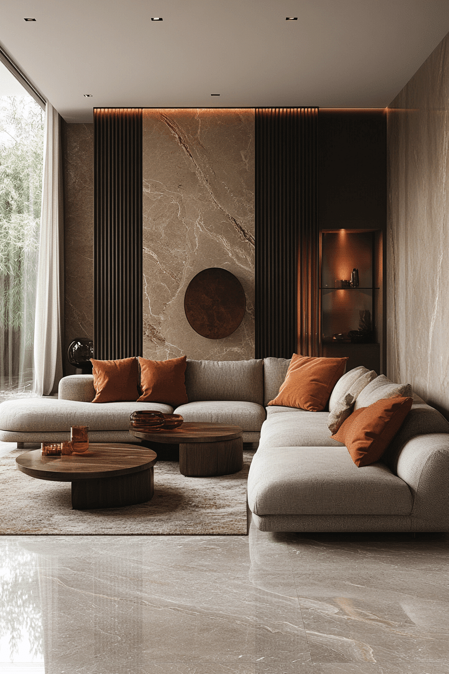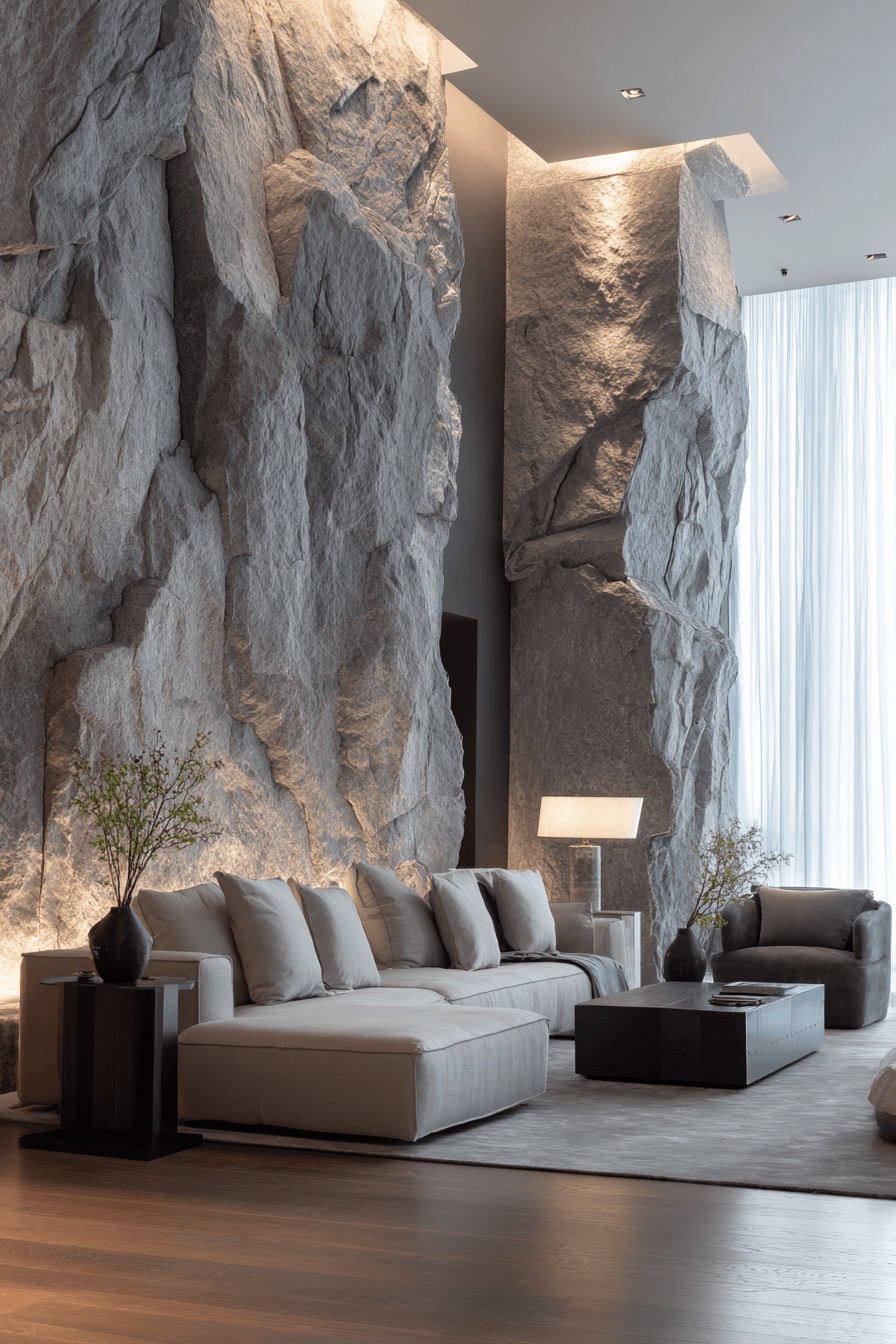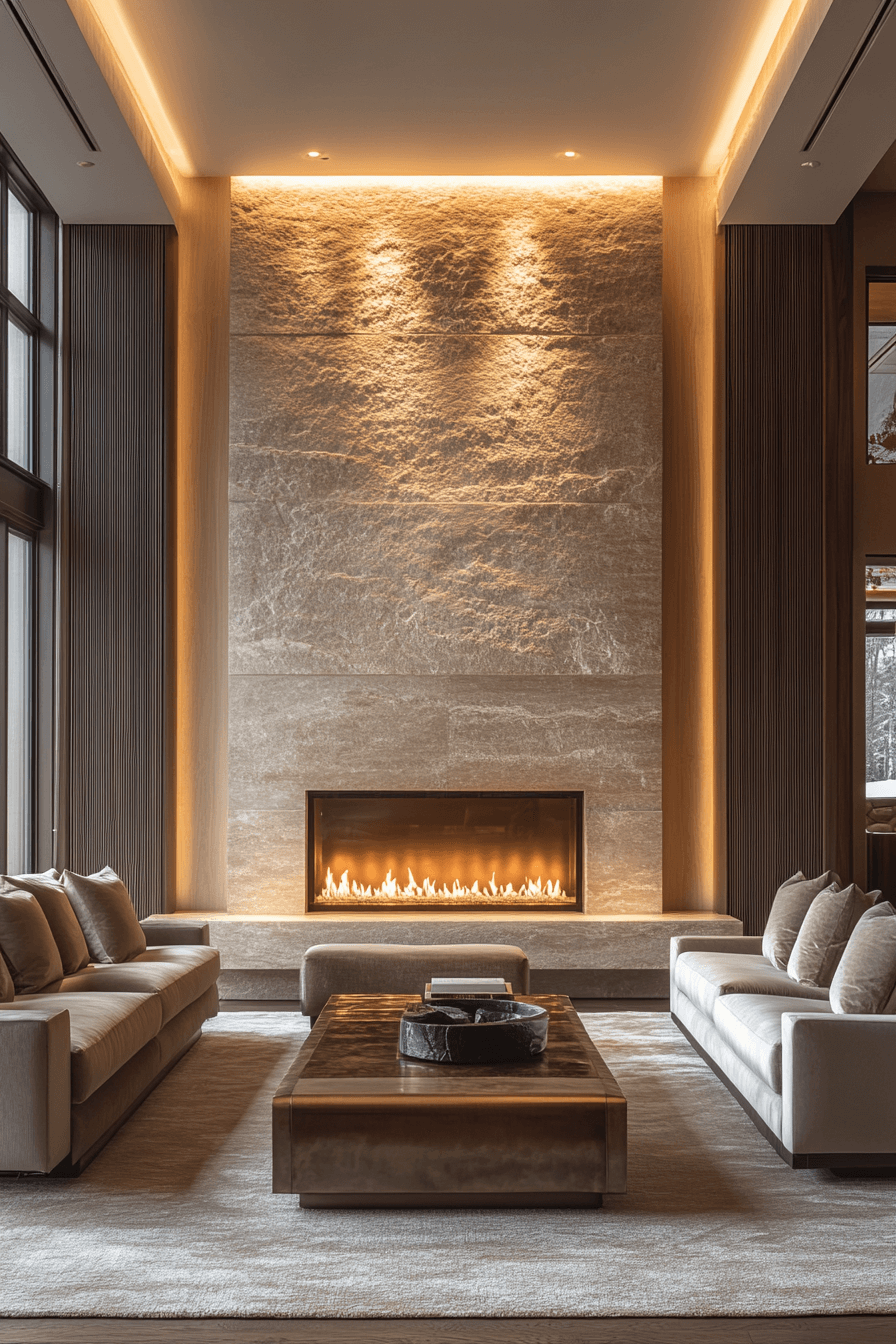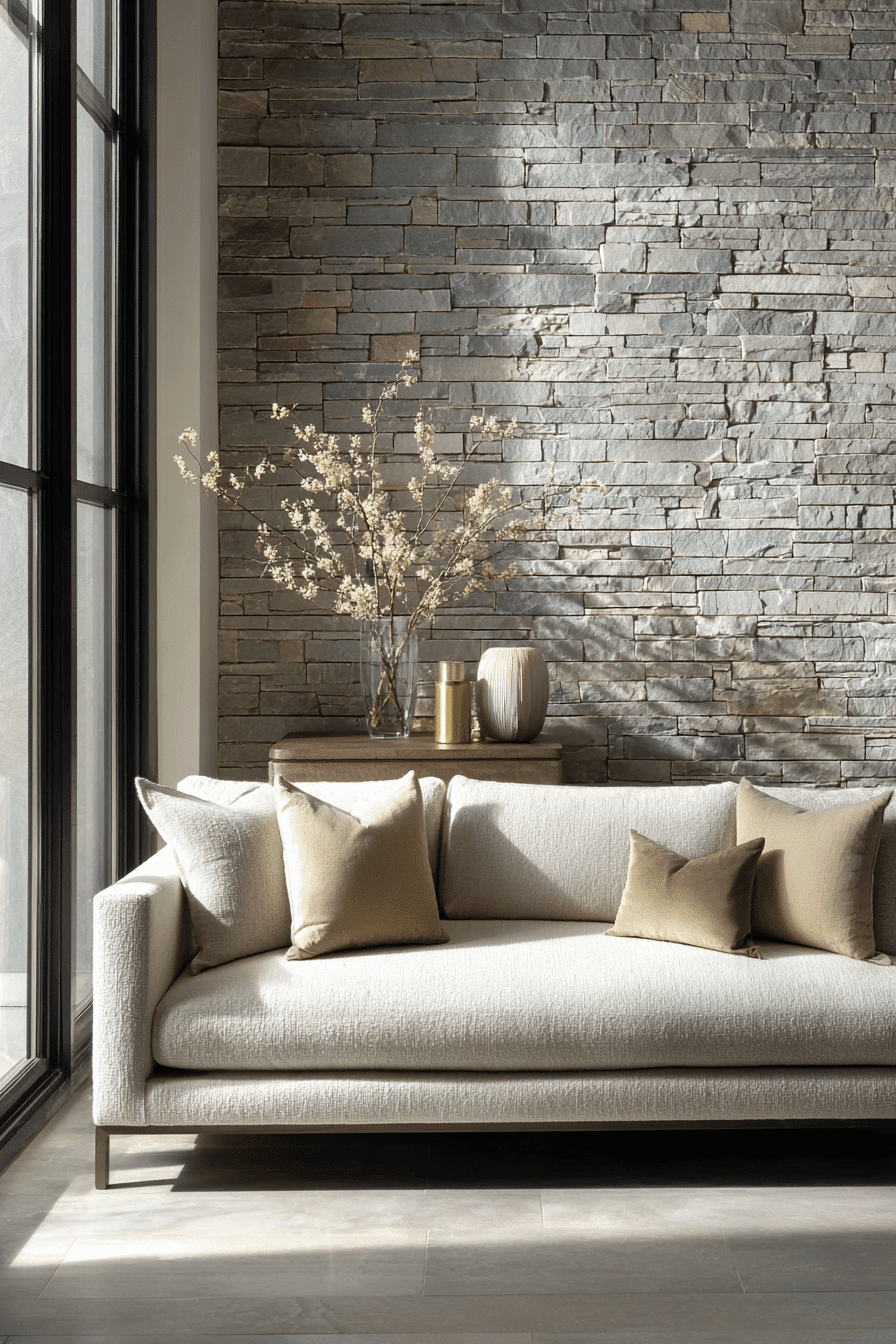 This modern luxury living room pairs cool slate tones with warm sandy neutrals for a perfectly balanced palette. The contrast between textured stone walls and soft upholstered seating creates visual depth while maintaining a calm atmosphere. Minimalist lines in the furniture keep the space feeling current and uncluttered. Subtle metallic accents and curated decor pieces bring in a layer of sophistication. It works seamlessly as a modern luxury living room because it combines earthy elements with sleek contemporary styling. Tap to explore how slate and sand tones can redefine your living area.