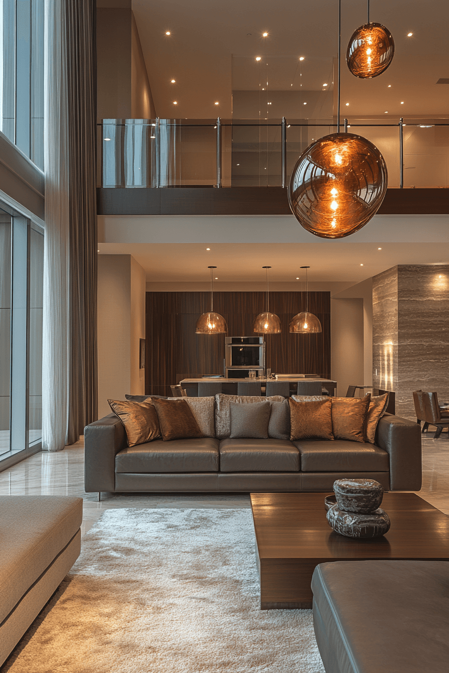 This modern luxury living room takes advantage of soaring ceilings and dramatic vertical space. Statement lighting draws the eye upward, enhancing the architectural grandeur. Oversized art and tall drapery balance the scale of the room. Sleek furnishings keep the design grounded and contemporary. It works beautifully in a modern luxury living room because it embraces openness while maintaining intimacy. Click to explore how double-height spaces can redefine your home.