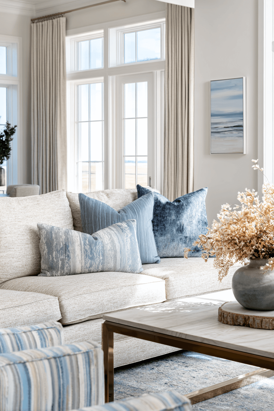 This modern luxury living room channels airy coastal vibes with soft blues, sandy neutrals, and natural textures. Clean lines and high-end finishes keep the look refined rather than theme-based. Large windows and light fabrics enhance the breezy atmosphere. Subtle metallic accents add polish to the relaxed palette. It succeeds as a modern luxury living room because it blends freshness with sophistication. Click to explore how coastal tones can refresh your home.