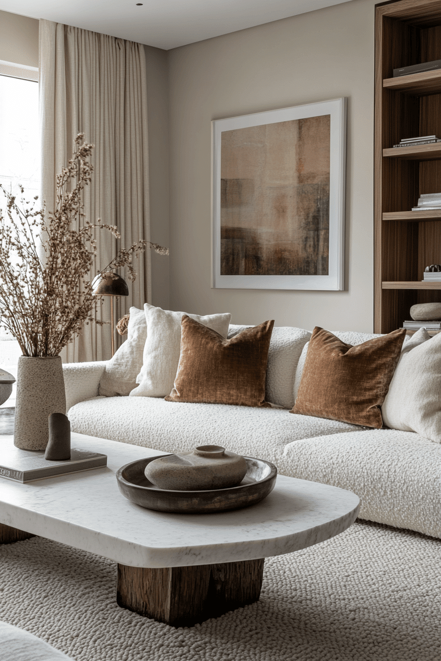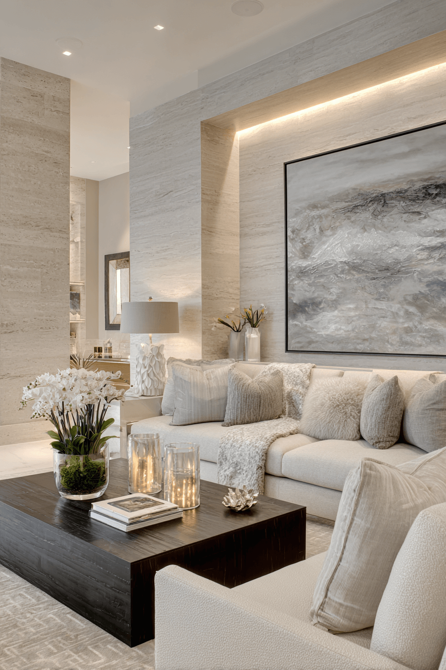 A harmonious blend of cream, taupe, ivory, and soft gray defines this modern luxury living room. Layering various neutral tones creates depth without relying on bold color. Textured fabrics, from boucle to linen, add tactile richness that feels upscale and inviting. Clean architectural lines and curated decor maintain a contemporary edge. This design approach works in a modern luxury living room because it feels timeless, serene, and visually cohesive. Tap to see how layered neutrals can bring calm sophistication to your space.