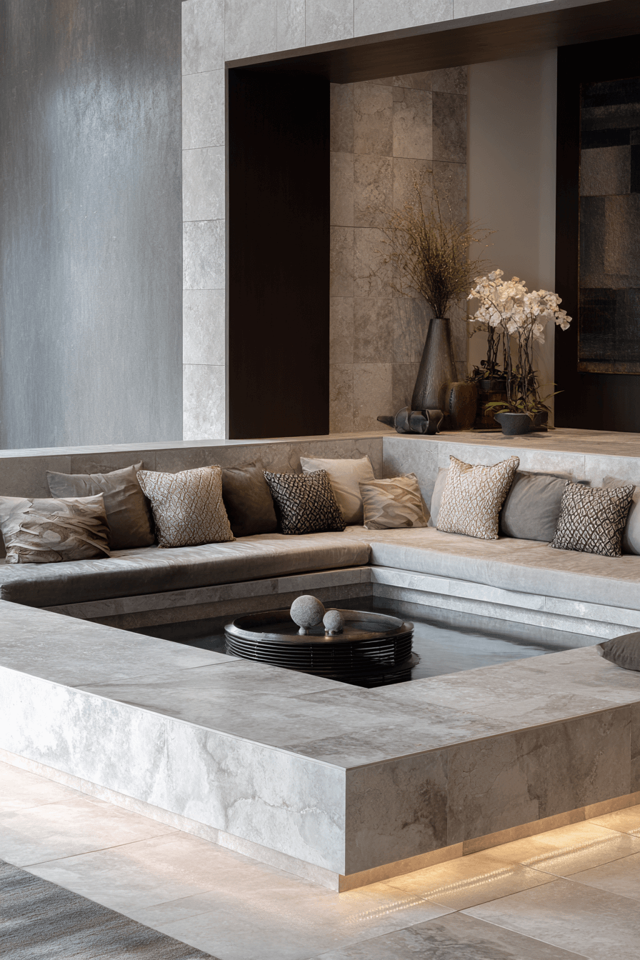 This modern luxury living room features a sunken seating area that feels intimate and architectural. Plush cushions and layered textures create a cozy gathering zone. Clean lines and neutral tones maintain a contemporary feel. Integrated lighting subtly defines the lowered space. It thrives in a modern luxury living room because it balances bold design with comfort. Tap to explore how a conversation pit can redefine your layout.