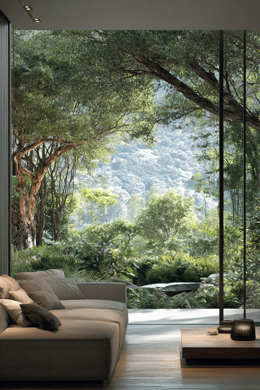 This modern luxury living room integrates lush greenery just beyond large glass doors or windows. The connection to nature adds tranquility while sleek furniture keeps the look refined. Neutral tones ensure the greenery becomes the natural focal point. Layered lighting enhances both indoor and outdoor elements. It succeeds in a modern luxury living room because it blends biophilic design with upscale finishes. Tap to see how nature can elevate your living space.
