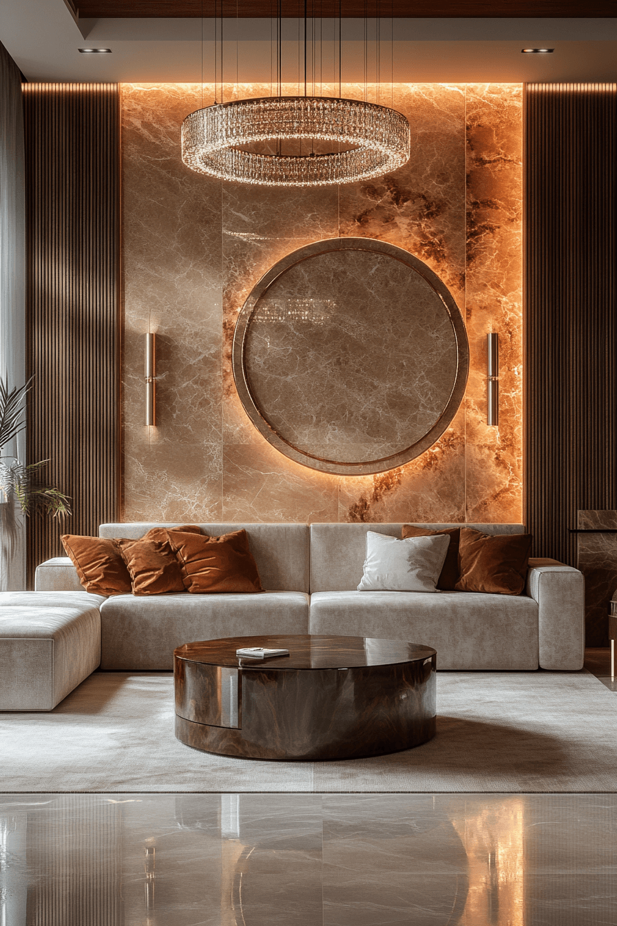 A dramatic backlit art wall becomes the centerpiece of this modern luxury living room. The glow enhances artwork and adds depth to the design. Minimal furnishings allow the illuminated feature to shine. Neutral tones keep the look cohesive and sophisticated. It works seamlessly in a modern luxury living room because it fuses art and architecture. Click to discover how a backlit art wall can elevate your decor.