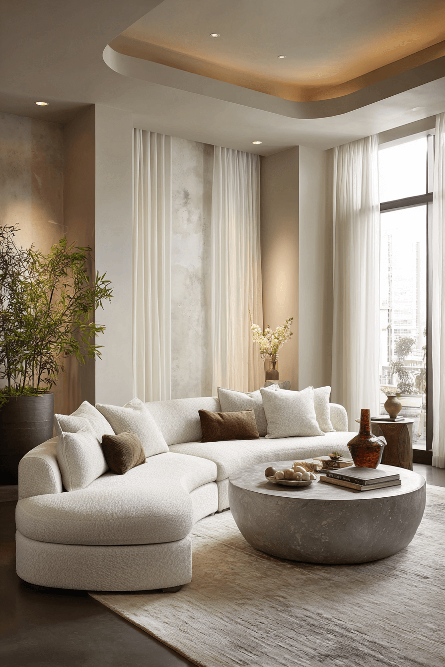 A curved sectional instantly makes this modern luxury living room feel welcoming and design-forward. The soft silhouette encourages conversation while adding architectural interest to the space. Paired with a round coffee table and layered lighting, the layout feels intentional and cohesive. Neutral fabrics and refined finishes prevent the curves from feeling overly trendy. This concept thrives in a modern luxury living room because it merges comfort, elegance, and contemporary form. Click to see how a curved sofa can become the heart of your home.