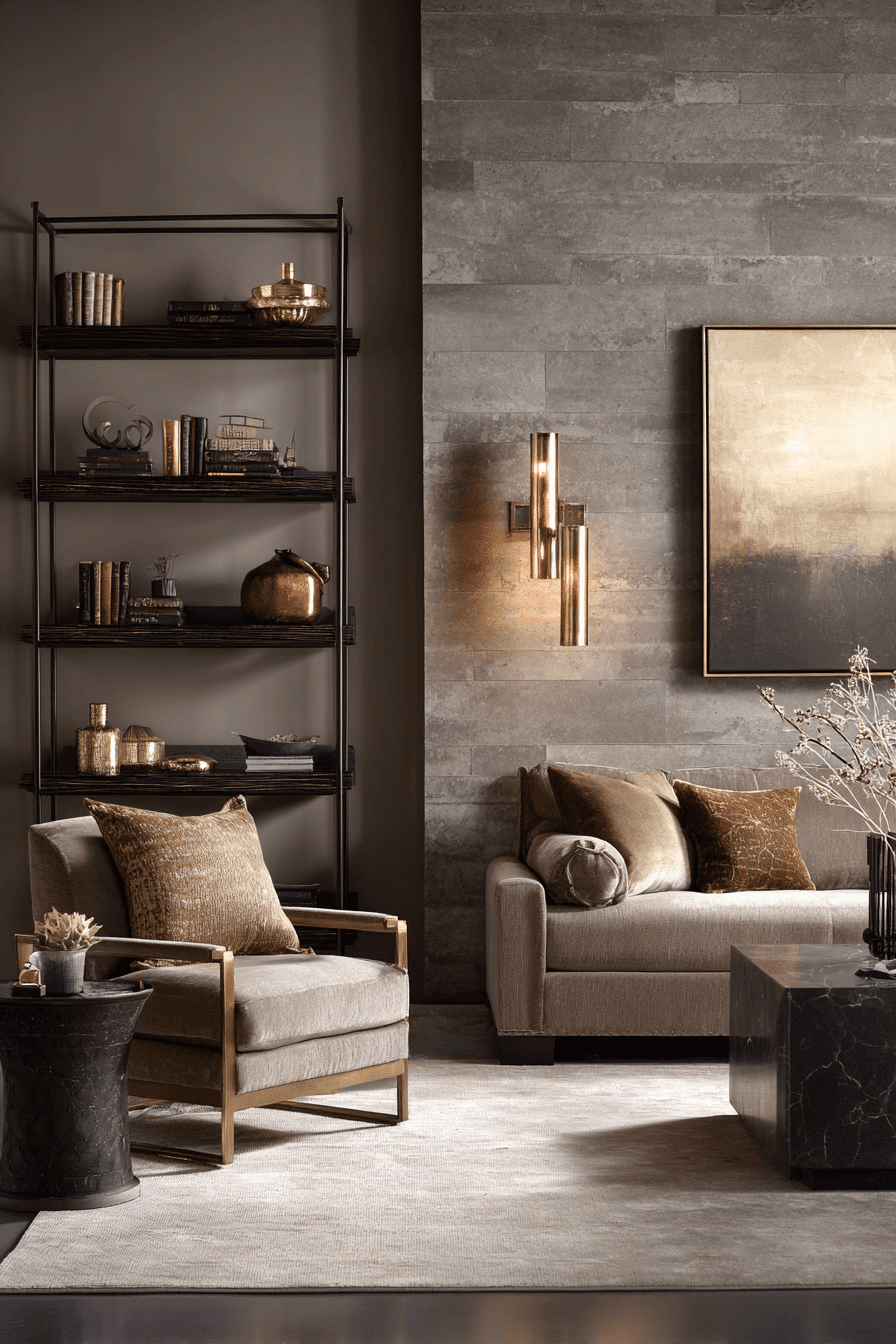 This modern luxury living room features subtle bronze trim on shelving, lighting, or furniture legs for a refined glow. The warm metallic accents contrast beautifully with neutral upholstery and smooth stone surfaces. Carefully layered lighting highlights the bronze details without overpowering the design. Plush seating and soft textiles add comfort while maintaining a tailored look. It succeeds as a modern luxury living room because it balances warmth and sophistication effortlessly. Click to learn how bronze accents can elevate your living room aesthetic.