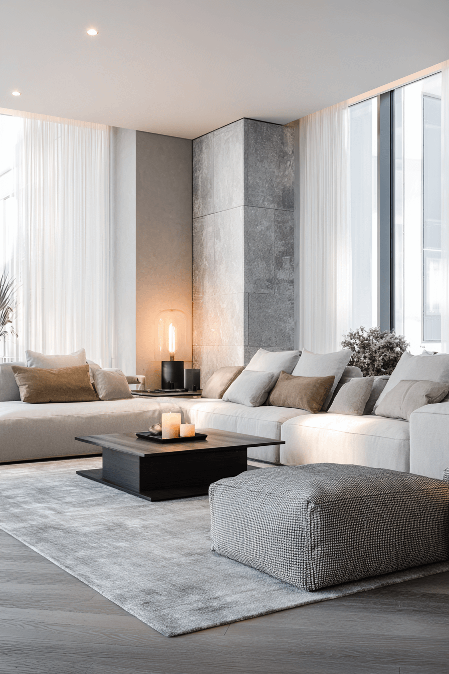 Clean lines and uncluttered surfaces define this modern luxury living room with a soft minimalist approach. The seating is arranged to encourage conversation without unnecessary distractions. A neutral palette paired with subtle textures creates visual interest while staying refined. Hidden storage keeps everyday items out of sight for a polished look. This concept thrives in a modern luxury living room because it prioritizes simplicity and intention. Tap to discover how soft minimalism can redefine your home.