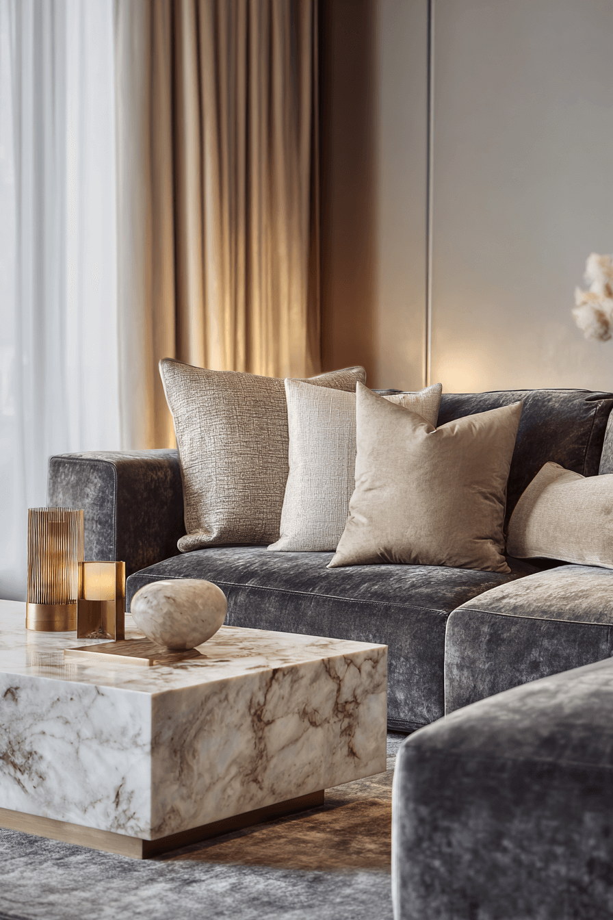 This modern luxury living room centers around a plush velvet sofa that feels as soft and inviting as a cloud. The rich texture instantly elevates the space, especially when paired with sleek marble or stone accents and warm metallic details. Layered throw pillows and a sculptural coffee table add dimension without cluttering the layout. Floor-to-ceiling drapery and soft ambient lighting create a cocoon-like atmosphere that feels both intimate and refined. This style works beautifully in a modern luxury living room because it blends tactile comfort with polished, high-end finishes. Click to discover how a velvet cloud lounge can transform your living space into pure comfort.