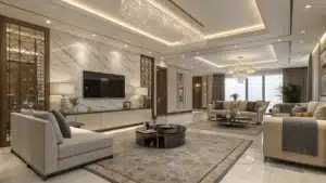 A striking stone feature wall instantly grounds this modern luxury living room. The natural texture contrasts beautifully with smooth upholstery and sleek flooring. Integrated lighting enhances the stone’s depth and dimension. Minimal furniture silhouettes keep the look contemporary and balanced. This style works as a modern luxury living room because it combines raw texture with refined finishes. Click to see how a stone feature wall can become your focal point.
