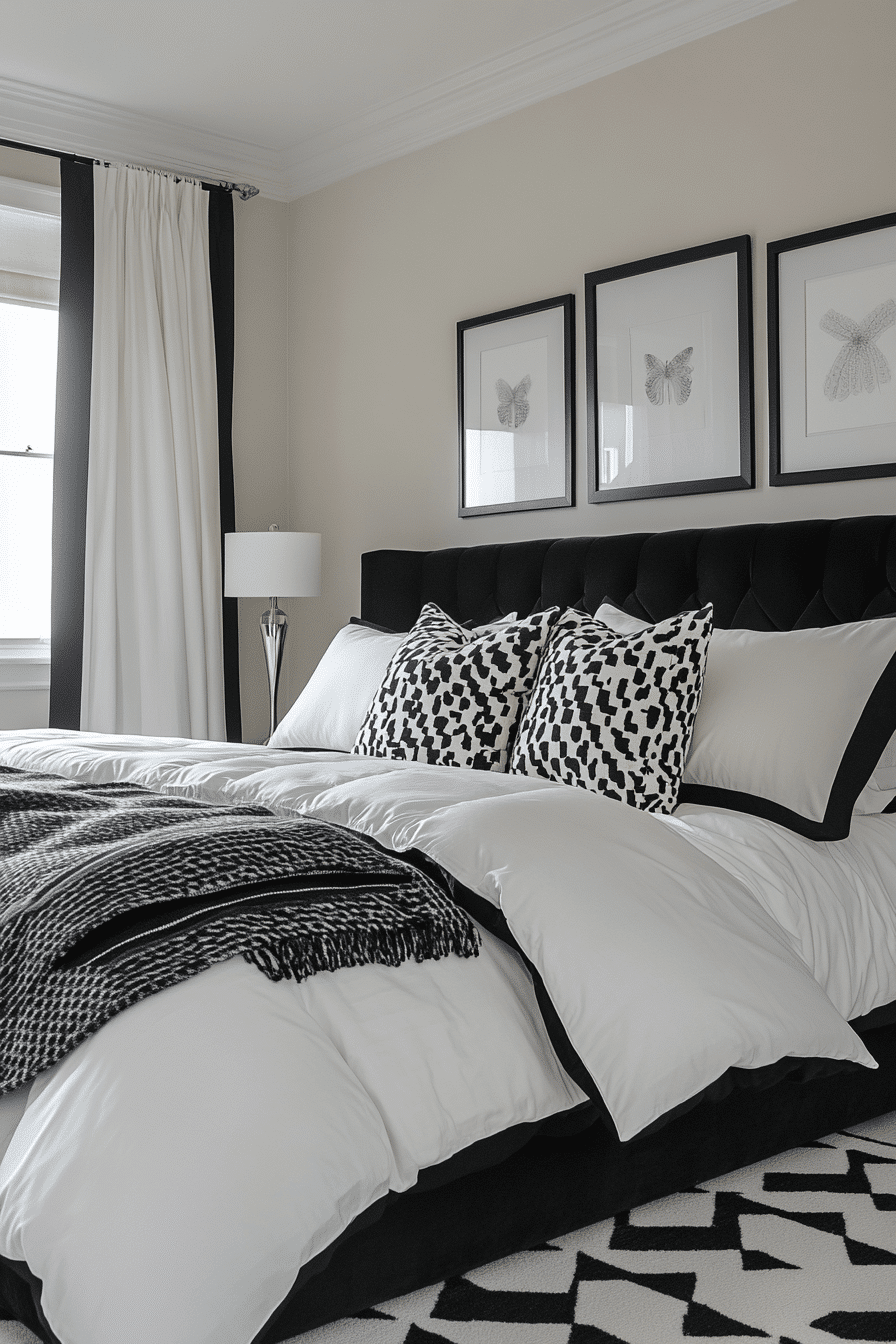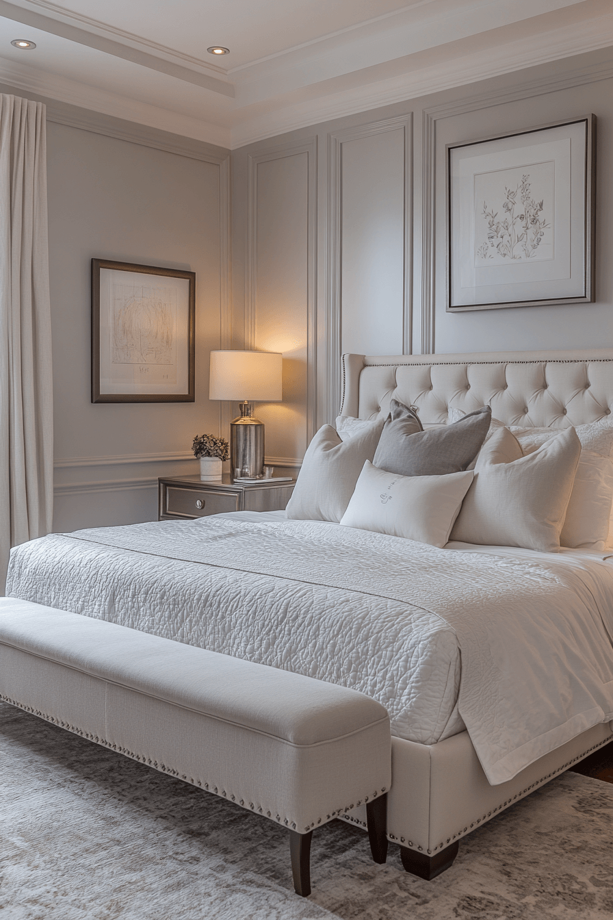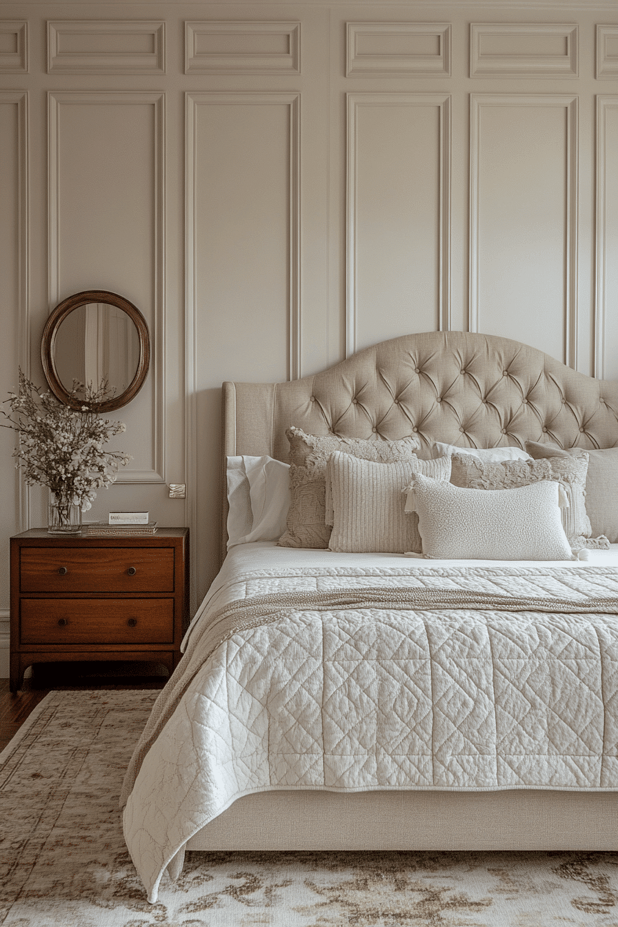 Decorative trim and molding give this Neo Deco bedroom a graphic, statement-making look. Painted borders and custom paneling add architecture and visual impact. The room feels upscale and tailored without being stuffy. Accents in gold and matte black frame the room like a work of art. This design proves detail is everything. Upgrade your space with bold beauty!