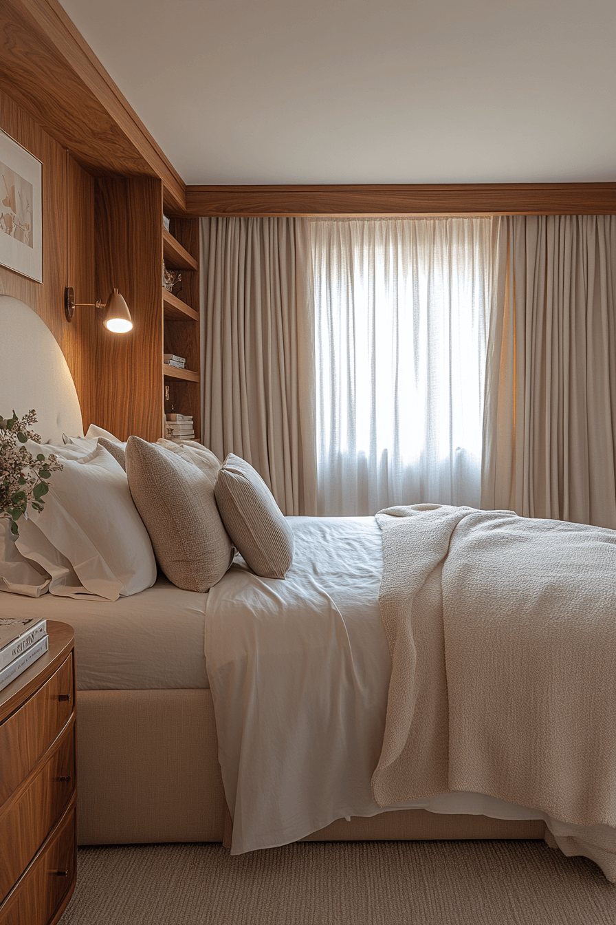 A peaceful layout and clean lines define this Neo Deco bedroom idea. The symmetry, tone-on-tone palette, and minimal fuss create a sanctuary. Sculptural details and polished materials elevate the minimalist approach. The room feels tranquil but never dull. It’s a perfect match for modern minds seeking calm and beauty. Design your serene escape today!