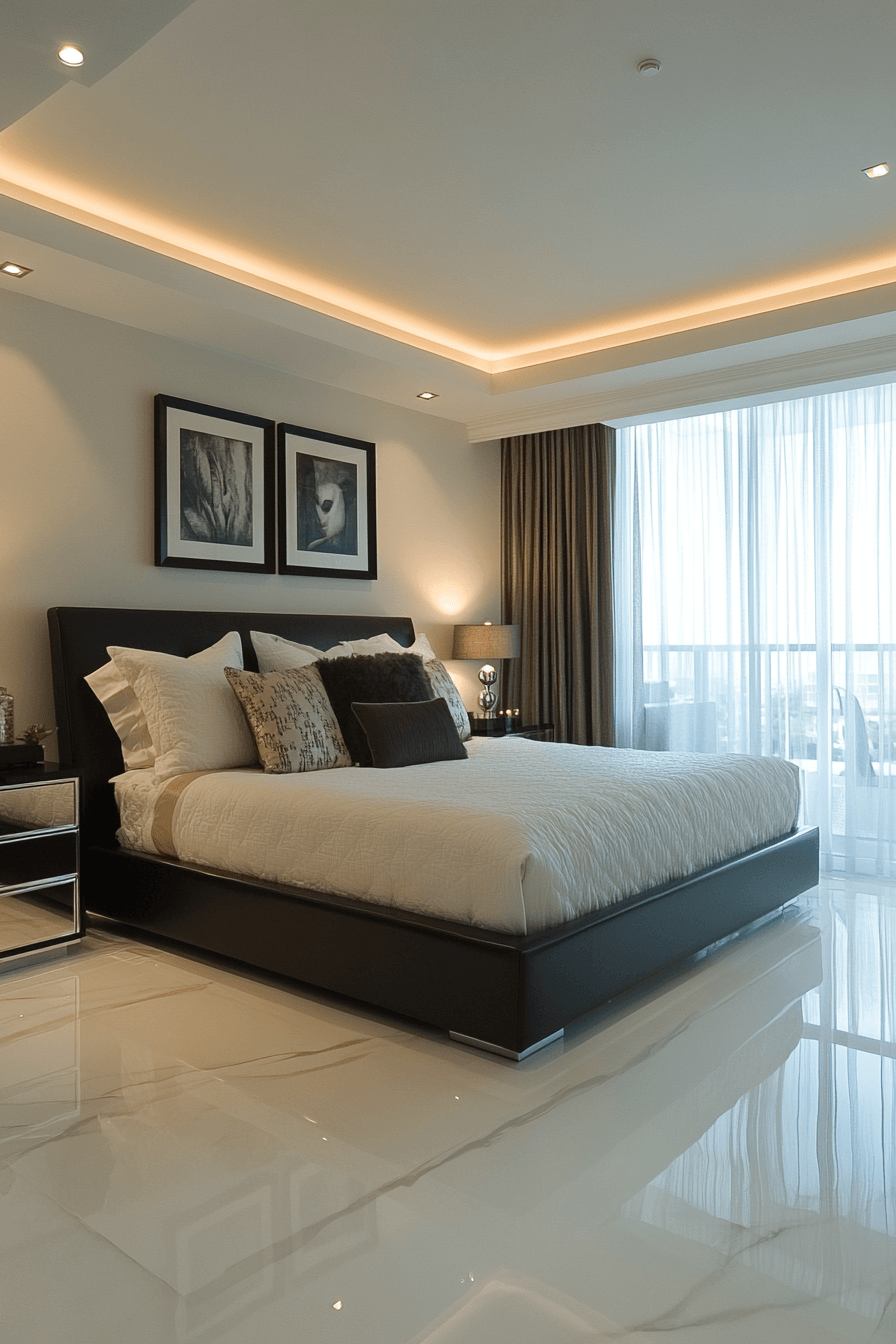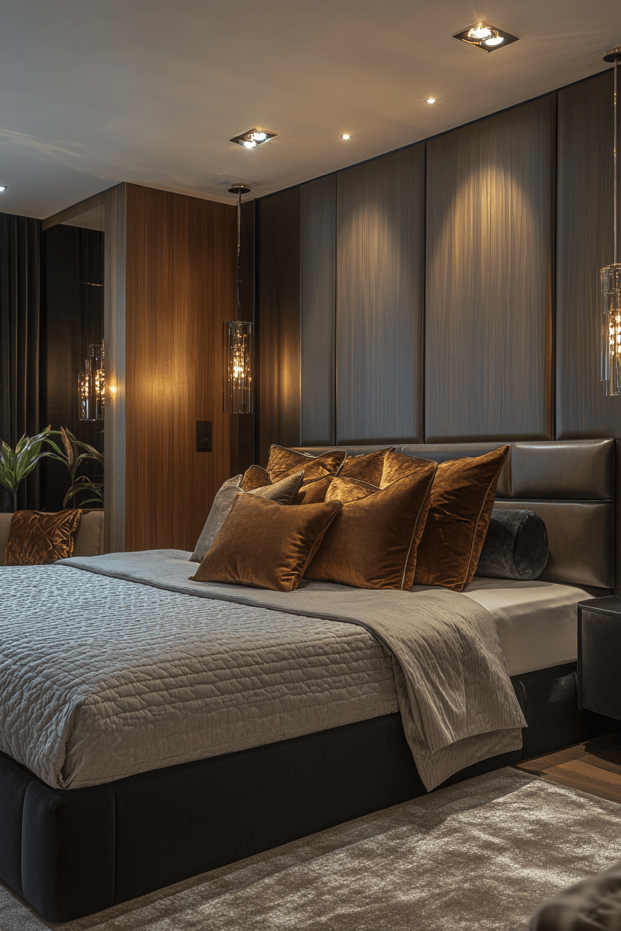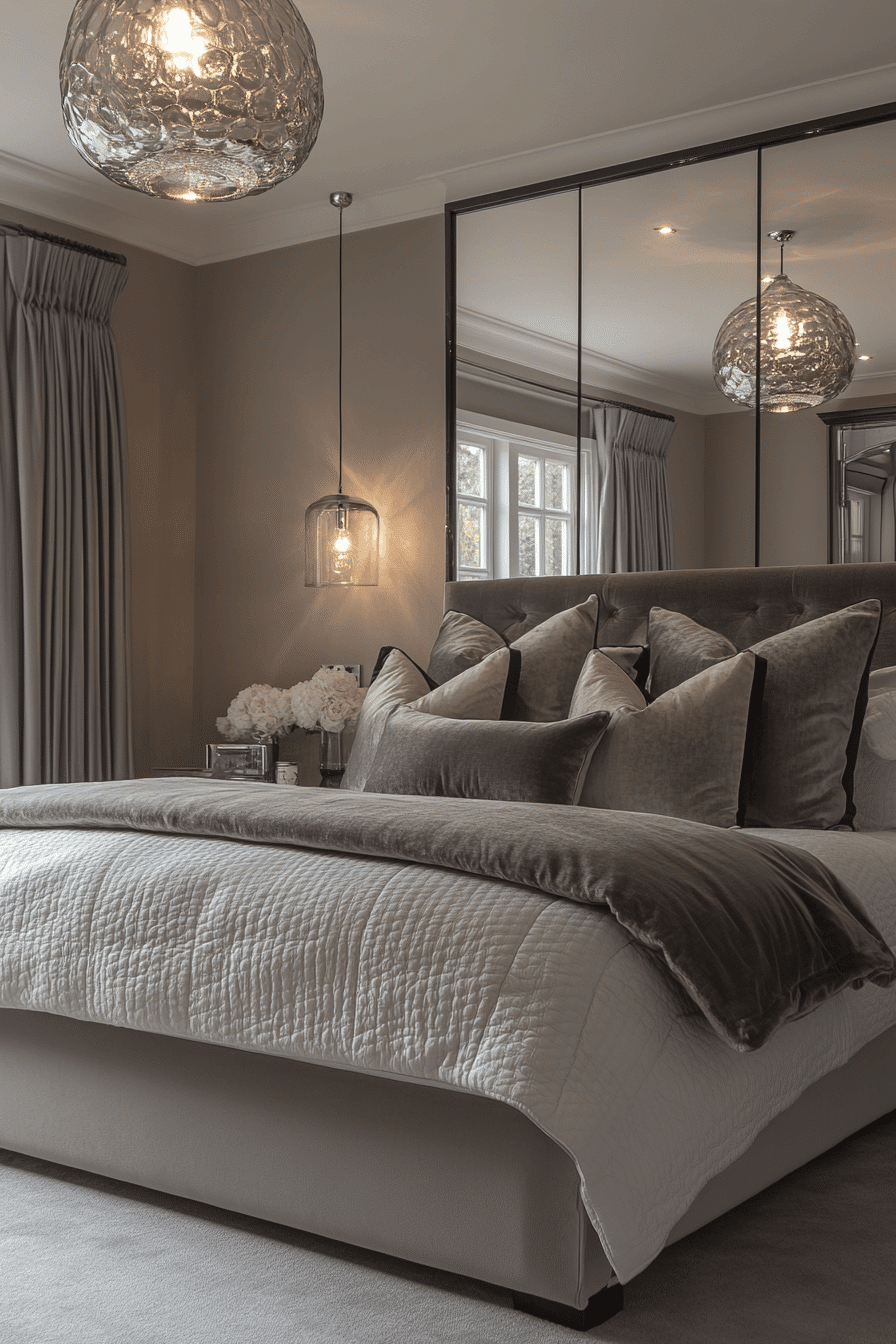 Reflective surfaces meet rich neutrals in this moody Neo Deco bedroom style. Smoky mirrors add dimension and amplify soft lighting, casting a glamorous ambiance. Sleek black frames and silvery accents create visual contrast and polish. The effect is dramatic yet serene, perfect for night-time unwinding. This design works especially well in compact rooms that need extra light and sparkle. Get inspired by this dreamy mirrored look!