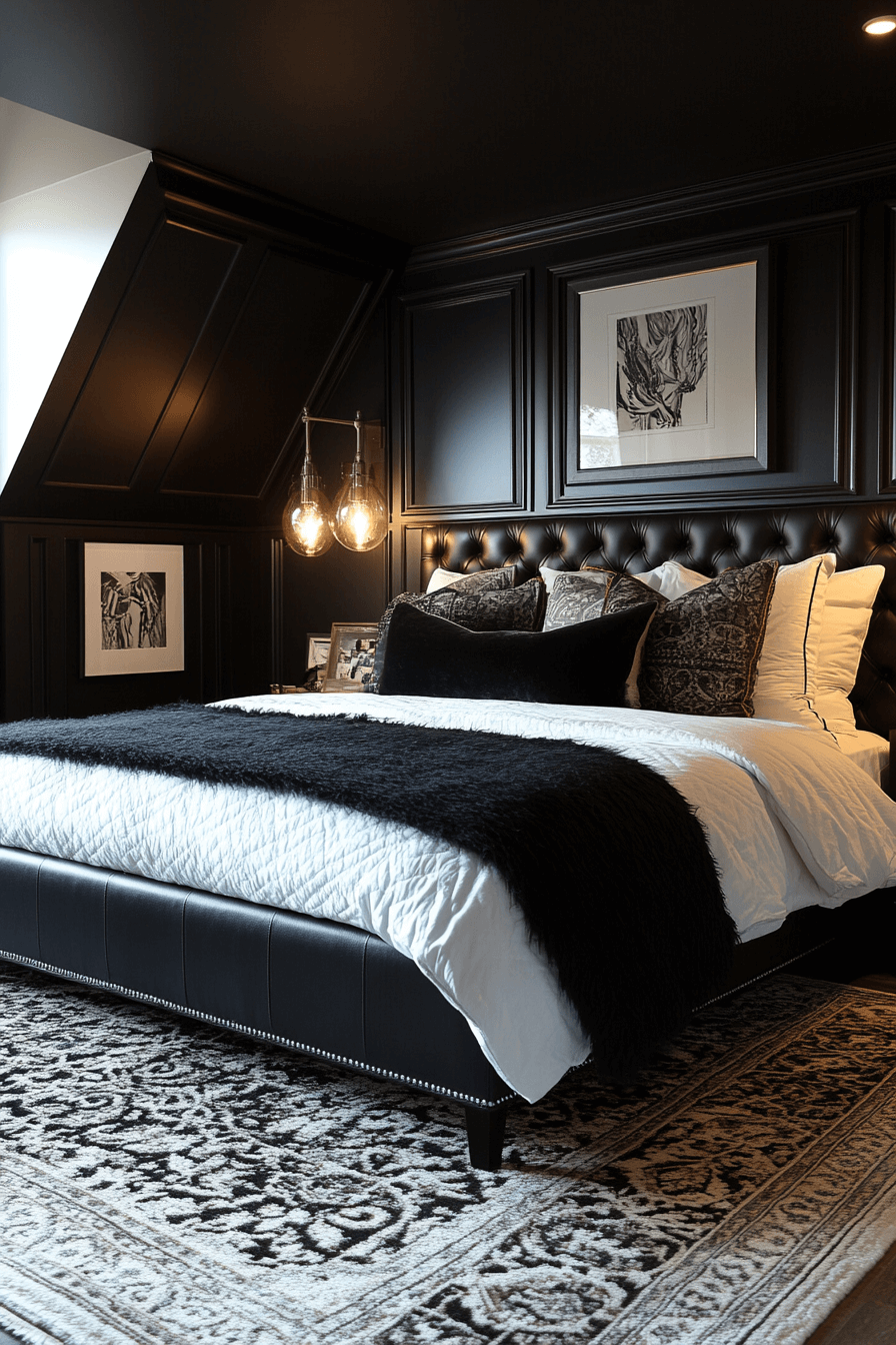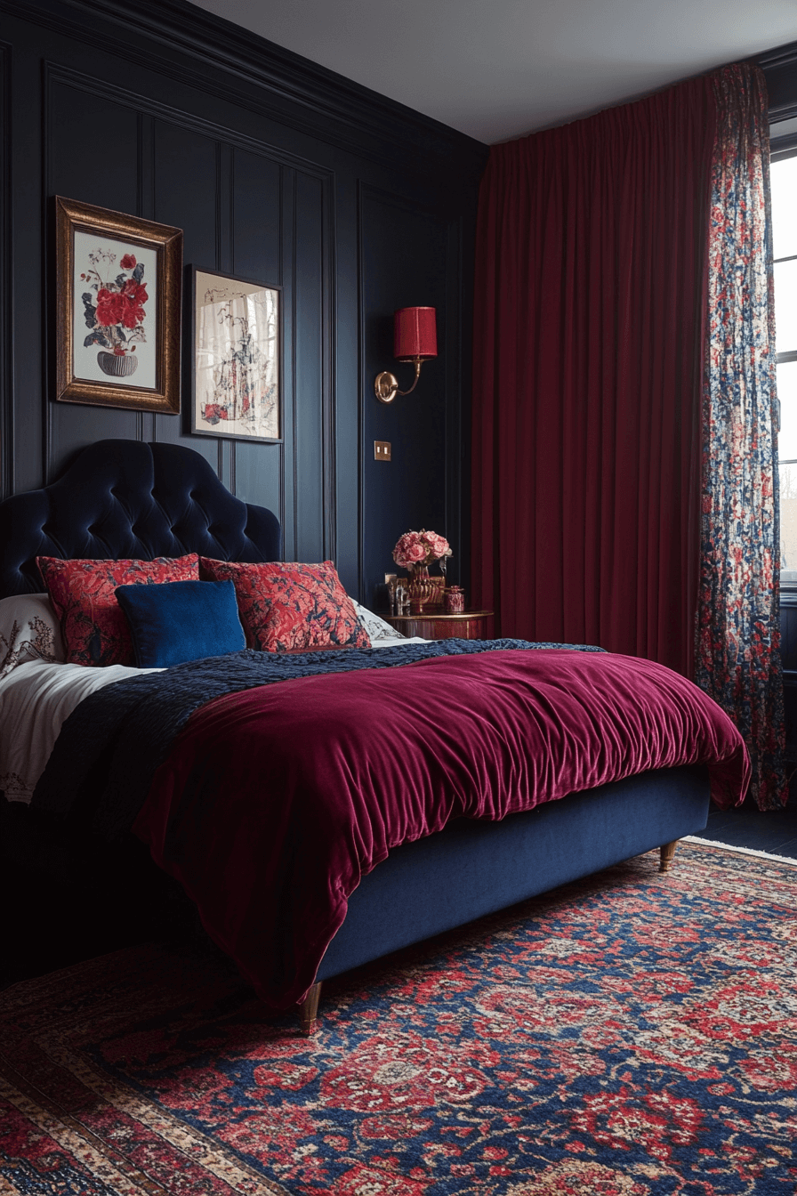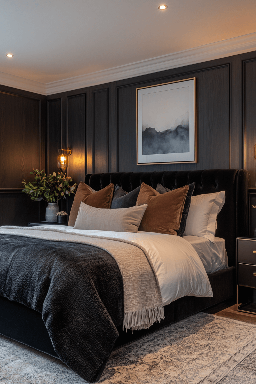 Deep navy, charcoal, and plum tones set the mood in this richly hued Neo Deco bedroom. These night-inspired shades create a cocoon-like feel that’s stylish and grounding. Gold lighting and velvet accents add just enough sparkle. The contrast between dark and glimmering textures brings modern drama. This design turns any bedroom into a dreamy retreat. Unwind in your own nightfall oasis!