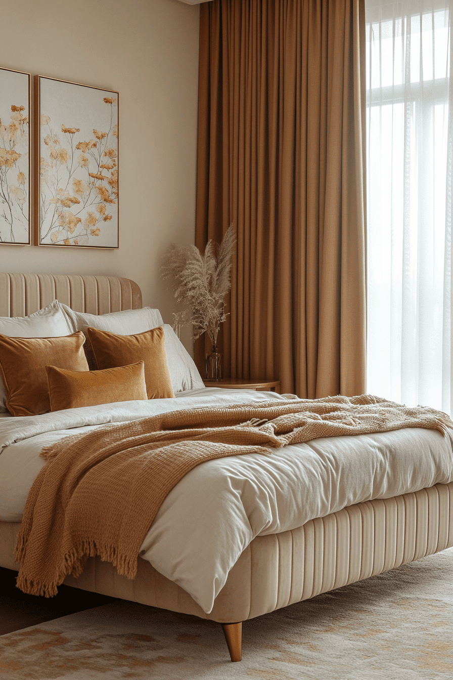Warm sunset tones—rust, peach, and soft gold—breathe warmth into this Neo Deco bedroom idea. These colors soften the structured lines of Deco furniture and add a welcoming glow. Gold accents highlight the palette and reflect the sunset theme. The blend of warmth and geometry creates balance and style. It’s a perfect design for cozy yet elegant vibes. Fall in love with sunset tones here!