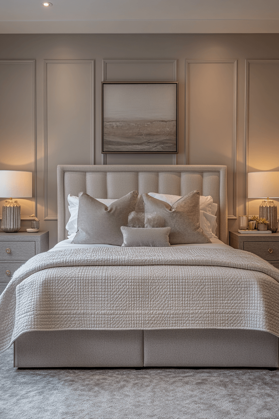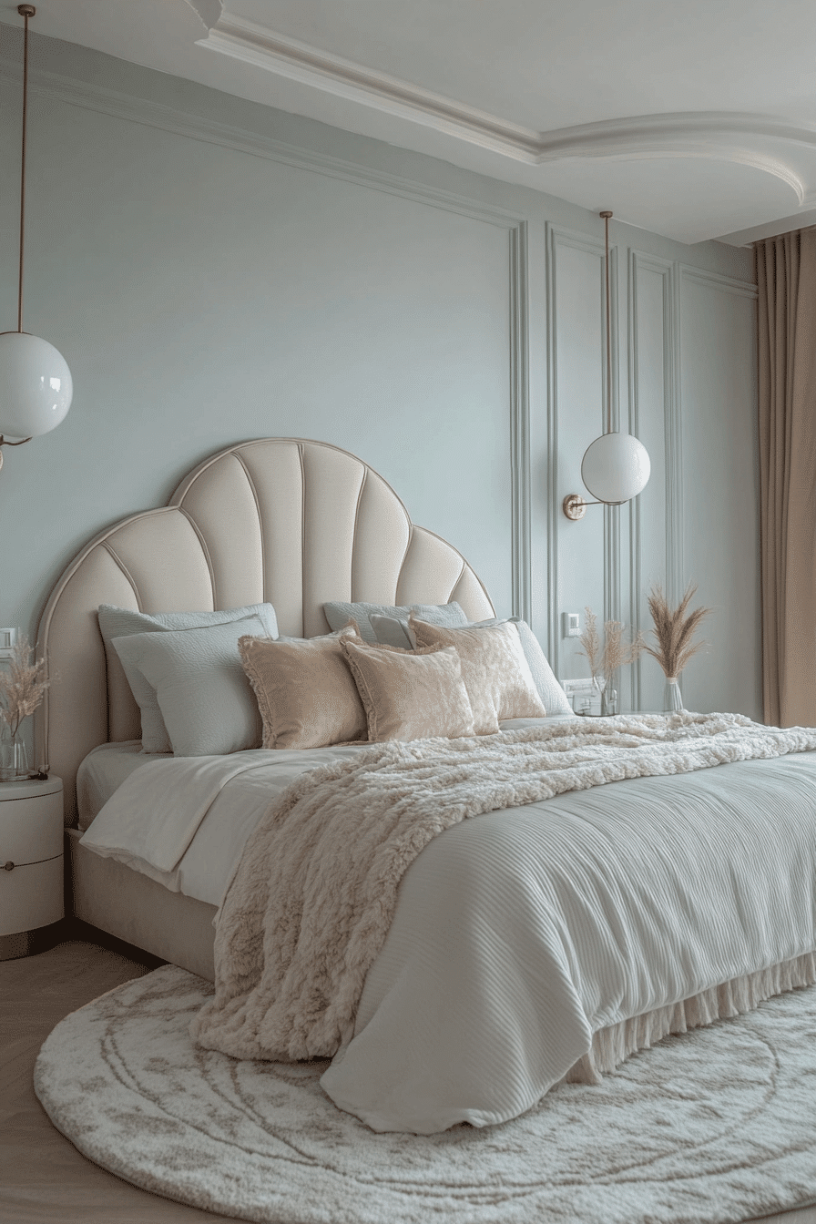 Soft whites and muted grays define this elegantly cool Neo Deco bedroom look. These tones give a calming, sophisticated vibe with just enough contrast. Pearlescent finishes and pewter accents reflect light in subtle ways. The combination feels fresh, upscale, and beautifully modern. It’s a perfect palette for tranquil glam. Discover the power of soft shine!