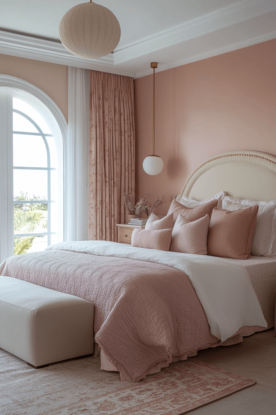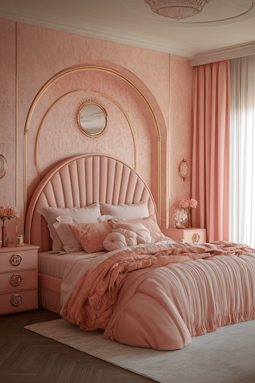 A Neo Deco bedroom comes to life with warm blush hues paired with sleek brass accents. The softness of blush keeps the palette romantic, while brass details give it a refined, golden glow. Rounded mirrors and furniture silhouettes nod to Deco’s classic curves. This pairing brings both femininity and power to your bedroom space. It’s a refreshing update on traditional Deco luxury. Click for a fresh dose of deco charm!